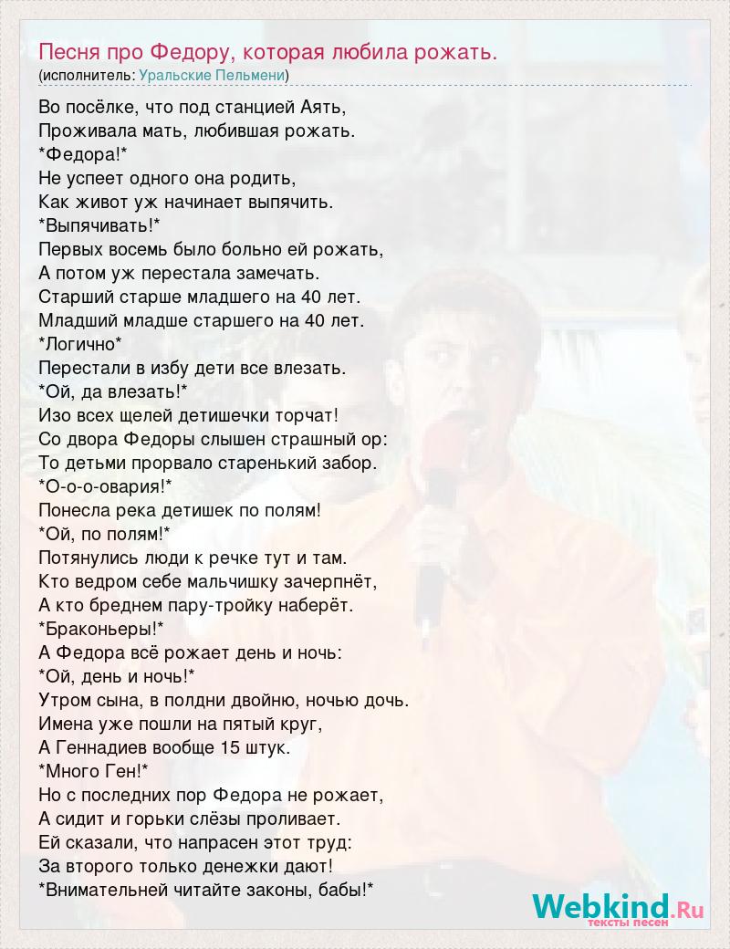 Во посёлке, что под станцией Аять, Проживала мать, любившая рожать. *Федора!* Не успеет одного она родить, Как живот уж начинает выпячить. *Выпячивать!* Первых восемь было больно ей рожать, А потом уж перестала замечать. Старший старше младшего на 40 лет. Младший младше старшего на 40 лет. *Логично* Перестали в избу дети все влезать. *Ой, да влезать!* Изо всех щелей детишечки торчат! Со двора Федоры слышен страшный ор: То детьми прорвало старенький забор. *О-о-о-овария!* Понесла река детишек по полям! *Ой, по полям!* Потянулись люди к речке тут и там. Кто ведром себе мальчишку зачерпнёт, А кто бреднем пару-тройку наберёт. *Браконьеры!* А Федора всё рожает день и ночь: *Ой, день и ночь!* Утром сына, в полдни двойню, ночью дочь. Имена уже пошли на пятый круг, А Геннадиев вообще 15 штук. *Много Ген!* Но с последних пор Федора не рожает, А сидит и горьки слёзы проливает. Ей сказали, что напрасен этот труд: За второго только денежки дают! *Внимательней читайте законы, бабы!*