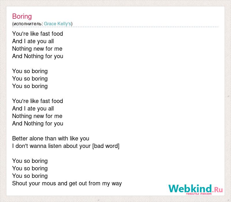 You're like fast food And I ate you all Nothing new for me And Nothing for you You so boring You so boring You so boring You're like fast food And I ate you all Nothing new for me And Nothing for you Better alone than with like you I don't wanna listen about your [bad word] You so boring You so boring You so boring Shout your mous and get out from my way