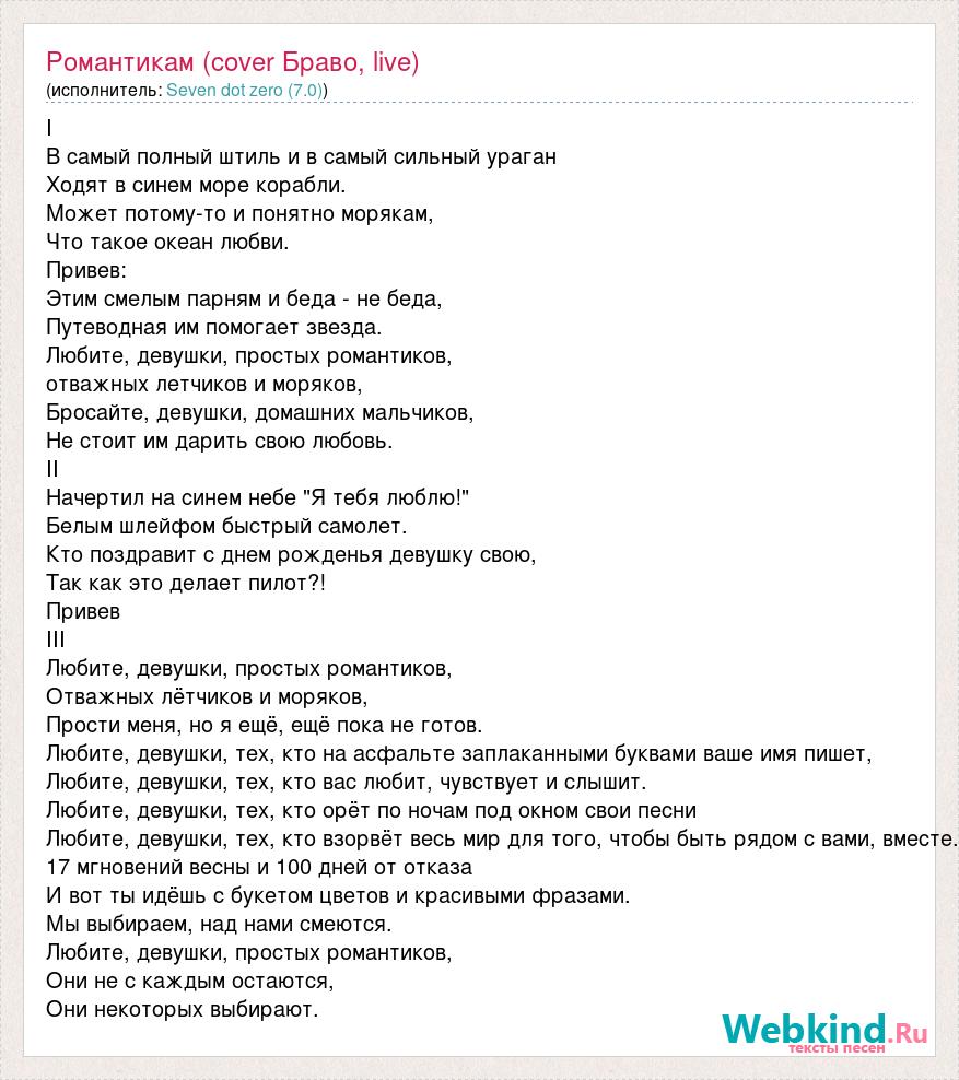 I В самый полный штиль и в самый сильный ураган Ходят в синем море корабли. Может потому-то и понятно морякам, Что такое океан любви. Привев: Этим смелым парням и беда - не беда, Путеводная им помогает звезда. Любите, девушки, простых романтиков, отважных летчиков и моряков, Бросайте, девушки, домашних мальчиков, Не стоит им дарить свою любовь. II Начертил на синем небе "Я тебя люблю!" Белым шлейфом быстрый самолет. Кто поздравит с днем рожденья девушку свою, Так как это делает пилот?! Привев III Любите, девушки, простых романтиков, Отважных лётчиков и моряков, Прости меня, но я ещё, ещё пока не готов. Любите, девушки, тех, кто на асфальте заплаканными буквами ваше имя пишет, Любите, девушки, тех, кто вас любит, чувствует и слышит. Любите, девушки, тех, кто орёт по ночам под окном свои песни Любите, девушки, тех, кто взорвёт весь мир для того, чтобы быть рядом с вами, вместе. 17 мгновений весны и 100 дней от отказа И вот ты идёшь с букетом цветов и красивыми фразами. Мы выбираем, над нами смеются. Любите, девушки, простых романтиков, Они не с каждым остаются, Они некоторых выбирают.