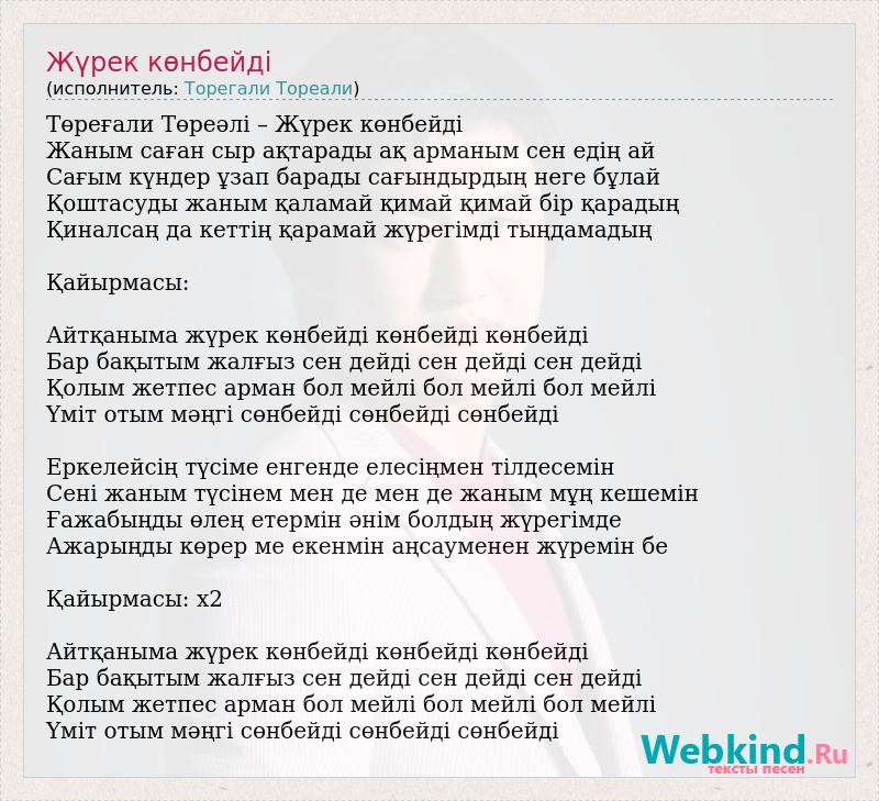 Төреғали Төреәлі – Жүрек көнбейді Жаным саған сыр ақтарады ақ арманым сен едің ай Сағым күндер ұзап барады сағындырдың неге бұлай Қоштасуды жаным қаламай қимай қимай бір қарадың Қиналсаң да кеттің қарамай жүрегімді тыңдамадың Қайырмасы: Айтқаныма жүрек көнбейді көнбейді көнбейді Бар бақытым жалғыз сен дейді сен дейді сен дейді Қолым жетпес арман бол мейлі бол мейлі бол мейлі Үміт отым мәңгі сөнбейді сөнбейді сөнбейді Еркелейсің түсіме енгенде елесіңмен тілдесемін Сені жаным түсінем мен де мен де жаным мұң кешемін Ғажабыңды өлең етермін әнім болдың жүрегімде Ажарыңды көрер ме екенмін аңсауменен жүремін бе Қайырмасы: х2 Айтқаныма жүрек көнбейді көнбейді көнбейді Бар бақытым жалғыз сен дейді сен дейді сен дейді Қолым жетпес арман бол мейлі бол мейлі бол мейлі Үміт отым мәңгі сөнбейді сөнбейді сөнбейді