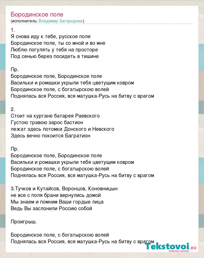 1. Я снова иду к тебе, русское поле Бородинское поле, ты со мной и во мне Люблю погулять у тебя на просторе Под сенью берез посидеть в тишине Пр. Бородинское поле, Бородинское поле Васильки и ромашки укрыли тебя цветущим ковром Бородинское поле, с богатырскою волей Поднялась вся Россия, вся матушка-Русь на битву с врагом 2. Стоит на кургане батарея Раевского Густою травою зарос бастион лежат здесь потомки Донского и Невского Здесь вечно покоится Багратион Пр. Бородинское поле, Бородинское поле Васильки и ромашки укрыли тебя цветущим ковром Бородинское поле, с богатырскою волей Поднялась вся Россия, вся матушка-Русь на битву с врагом 3.Тучков и Кутайсов, Воронцов, Коновницын не все с поля брани вернулись домой Мы знаем и помним Ваши гордые лица Ведь Вы заслонили Россию собой Проигрыш. Бородинское поле, с богатырскою волей Поднялась вся Россия, вся матушка-Русь на битву с врагом