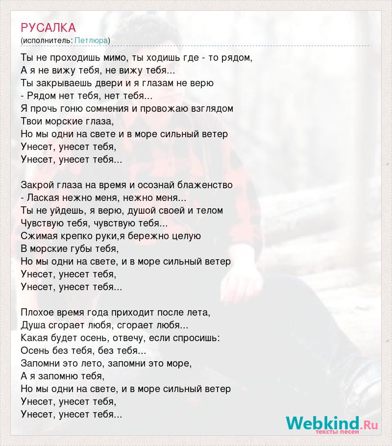 Ты не проходишь мимо, ты ходишь где - то рядом, А я не вижу тебя, не вижу тебя... Ты закрываешь двери и я глазам не верю - Рядом нет тебя, нет тебя... Я прочь гоню сомнения и провожаю взглядом Твои морские глаза, Но мы одни на свете и в море сильный ветер Унесет, унесет тебя, Унесет, унесет тебя... Закрой глаза на время и осознай блаженство - Лаская нежно меня, нежно меня... Ты не уйдешь, я верю, душой своей и телом Чувствую тебя, чувствую тебя... Сжимая крепко руки,я бережно целую В морские губы тебя, Но мы одни на свете, и в море сильный ветер Унесет, унесет тебя, Унесет, унесет тебя... Плохое время года приходит после лета, Душа сгорает любя, сгорает любя... Какая будет осень, отвечу, если спросишь: Осень без тебя, без тебя... Запомни это лето, запомни это море, А я запомню тебя, Но мы одни на свете, и в море сильный ветер Унесет, унесет тебя, Унесет, унесет тебя...