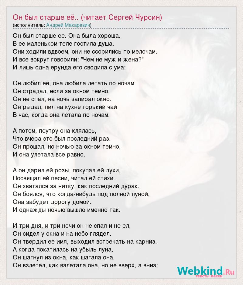 Он был старше ее. Она была хороша. В ее маленьком теле гостила душа. Они ходили вдвоем, они не ссорились по мелочам. И все вокруг говорили: "Чем не муж и жена?" И лишь одна ерунда его сводила с ума: Он любил ее, она любила летать по ночам. Он страдал, если за окном темно, Он не спал, на ночь запирал окно. Он рыдал, пил на кухне горький чай В час, когда она летала по ночам. А потом, поутру она клялась, Что вчера это был последний раз. Он прощал, но ночью за окном темно, И она улетала все равно. А он дарил ей розы, покупал ей духи, Посвящал ей песни, читал ей стихи. Он хватался за нитку, как последний дурак. Он боялся, что когда-нибудь под полной луной, Она забудет дорогу домой. И однажды ночью вышло именно так. И три дня, и три ночи он не спал и не ел, Он сидел у окна и на небо глядел. Он твердил ее имя, выходил встречать на карниз. А когда покатилась на убыль луна, Он шагнул из окна, как шагала она. Он взлетел, как взлетала она, но не вверх, а вниз: