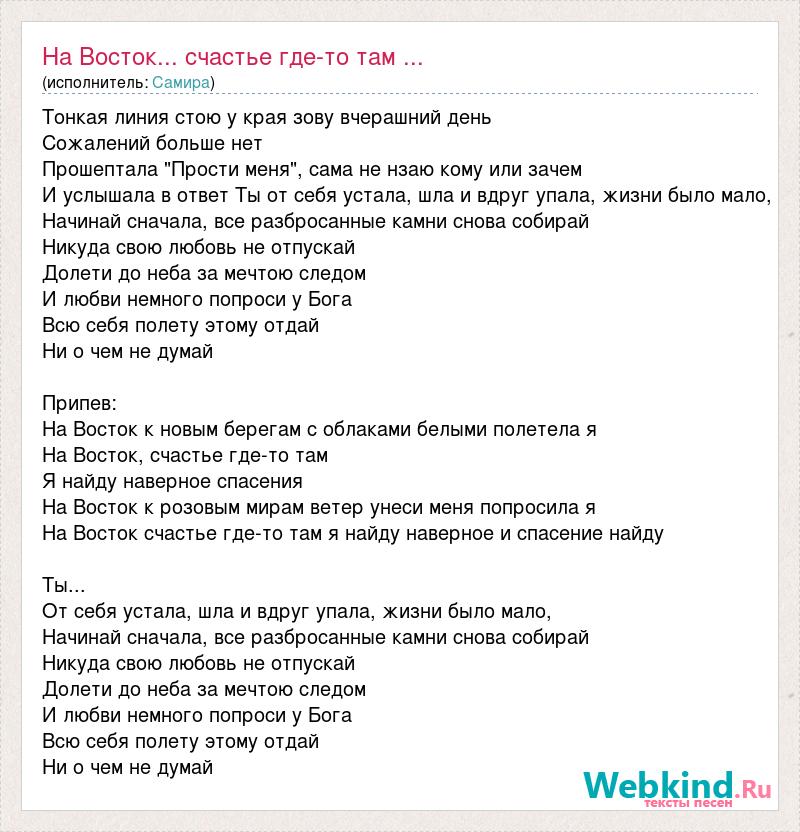 Тонкая линия стою у края зову вчерашний день Сожалений больше нет Прошептала "Прости меня", сама не нзаю кому или зачем И услышала в ответ Ты от себя устала, шла и вдруг упала, жизни было мало, Начинай сначала, все разбросанные камни снова собирай Никуда свою любовь не отпускай Долети до неба за мечтою следом И любви немного попроси у Бога Всю себя полету этому отдай Ни о чем не думай Припев: На Восток к новым берегам с облаками белыми полетела я На Восток, счастье где-то там Я найду наверное спасения На Восток к розовым мирам ветер унеси меня попросила я На Восток счастье где-то там я найду наверное и спасение найду Ты... От себя устала, шла и вдруг упала, жизни было мало, Начинай сначала, все разбросанные камни снова собирай Никуда свою любовь не отпускай Долети до неба за мечтою следом И любви немного попроси у Бога Всю себя полету этому отдай Ни о чем не думай
