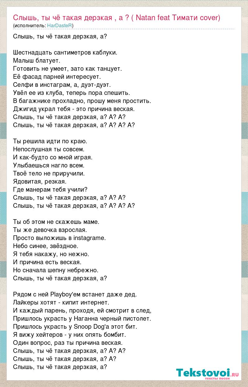Слышь, ты чё такая дерзкая, а? Шестнадцать сантиметров каблуки. Малыш блатует. Готовить не умеет, зато как танцует. Её фасад парней интересует. Селфи в инстаграм, а, дуэт-дуэт. Увёл ее из клуба, теперь пора спешить. В багажнике прохладно, прошу меня простить. Джигид украл тебя - это причина веская. Слышь, ты чё такая дерзкая, а? А? А? Слышь, ты чё такая дерзкая, а? А? А? А? Ты решила идти по краю. Непослушная ты совсем. И как-будто со мной играя. Улыбаешься нагло всем. Твоё тело не приручили. Ядовитая, резкая. Где манерам тебя учили? Слышь, ты чё такая дерзкая, а? А? А? Слышь, ты чё такая дерзкая, а? А? А? А? Ты об этом не скажешь маме. Ты же девочка взрослая. Просто выложишь в instagramе. Небо синее, звёздное. Я тебя накажу, но нежно. И причина есть веская. Но сначала шепну небрежно. Слышь, ты чё такая дерзкая, а? Рядом с ней Plаyboy'ем встанет даже дед. Лайкеры хотят - кипит интернет. И каждый парень, проходя, ей смотрит в след, Пришлось украсть у Наганна черный пистолет. Пришлось украсть у Snoop Dog'а этот бит. Я вижу хейтеров - у них опять бомбит. Один вопрос, раз ты причина веская. Слышь, ты чё такая дерзкая, а? А? А? Слышь, ты чё такая дерзкая, а? А? Слышь, ты чё такая дерзкая, а?