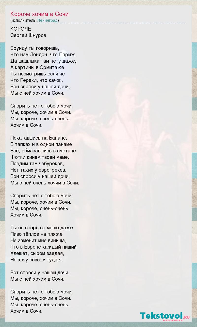 КОРОЧЕ Сергей Шнуров Ерунду ты говоришь, Что нам Лондон, что Париж. Да шашлыка там нету даже, А картины в Эрмитаже Ты посмотришь если чё Что Геракл, что качок, Вон спроси у нашей дочи, Мы с ней хочим в Сочи. Спорить нет с тобою мочи, Мы, короче, хочим в Сочи. Мы, короче, очень-очень, Хочим в Сочи. Покатавшись на Банане, В тапках и в одной панаме Все, обмазавшись в сметане Фотки кинем твоей маме. Поедим там чебуреков, Нет таких у еврогреков. Вон спроси у нашей дочи, Мы с ней очень хочим в Сочи. Спорить нет с тобою мочи, Мы, короче, хочим в Сочи. Мы, короче, очень-очень, Хочим в Сочи. Ты не спорь со мною даже Пиво тёплое на пляже Не заменит мне винища, Что в Европе каждый нищий Хлещет, сыром заедая, Не хочу совсем туда я. Вот спроси у нашей дочи, Мы с ней хочим в Сочи. Спорить нет с тобою мочи, Мы, короче, хочим в Сочи. Мы, короче, очень-очень, Хочим в Сочи.