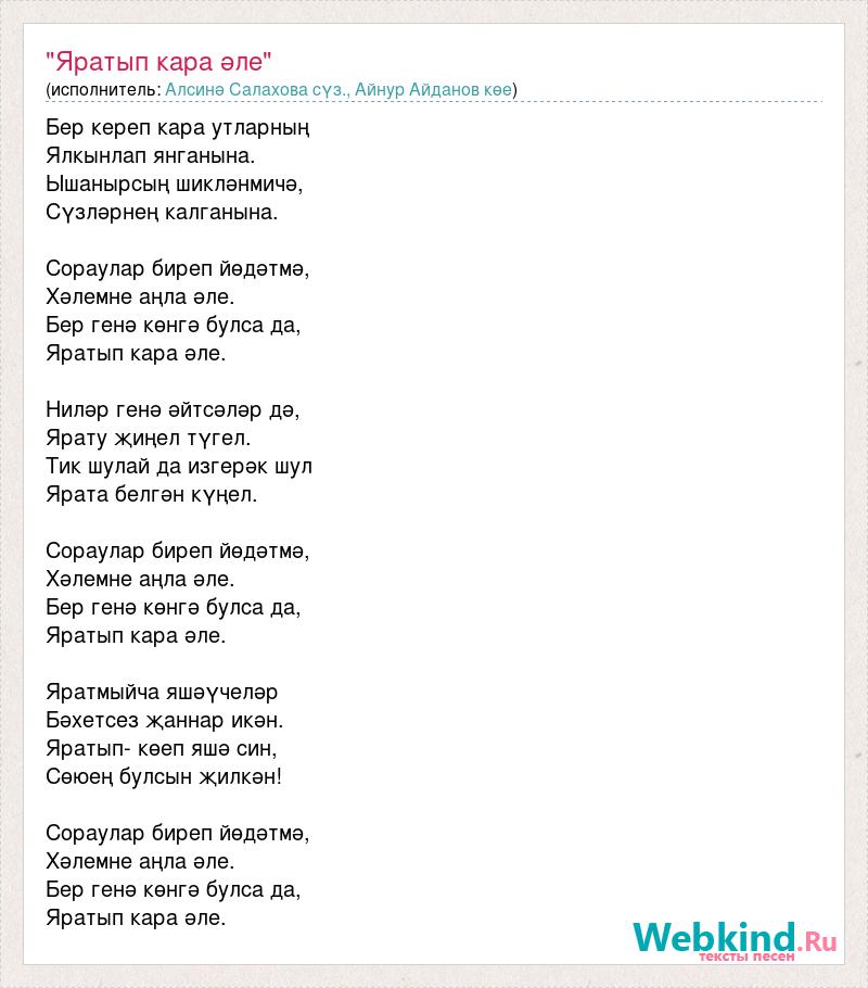 Бер кереп кара утларның Ялкынлап янганына. Ышанырсың шикләнмичә, Сүзләрнең калганына. Сораулар биреп йөдәтмә, Хәлемне аңла әле. Бер генә көнгә булса да, Яратып кара әле. Ниләр генә әйтсәләр дә, Ярату җиңел түгел. Тик шулай да изгерәк шул Ярата белгән күңел. Сораулар биреп йөдәтмә, Хәлемне аңла әле. Бер генә көнгә булса да, Яратып кара әле. Яратмыйча яшәүчеләр Бәхетсез җаннар икән. Яратып- көеп яшә син, Сөюең булсын җилкән! Сораулар биреп йөдәтмә, Хәлемне аңла әле. Бер генә көнгә булса да, Яратып кара әле.
