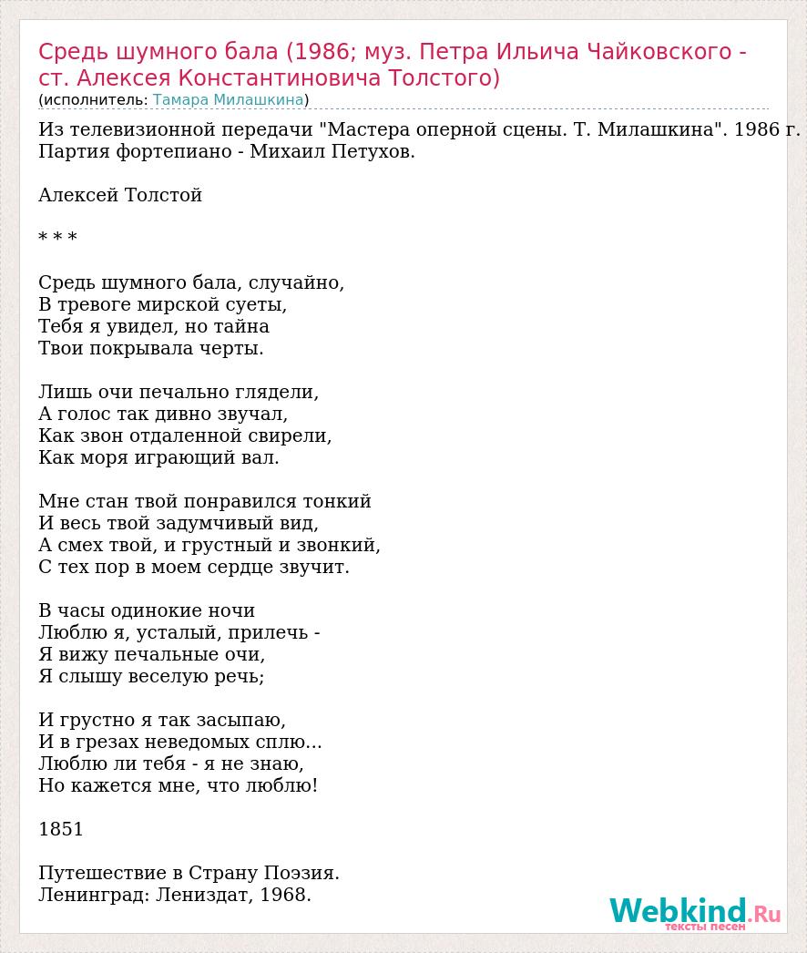 Из телевизионной передачи "Мастера оперной сцены. Т. Милашкина". 1986 г. Партия фортепиано - Михаил Петухов. Алексей Толстой * * * Средь шумного бала, случайно, В тревоге мирской суеты, Тебя я увидел, но тайна Твои покрывала черты. Лишь очи печально глядели, А голос так дивно звучал, Как звон отдаленной свирели, Как моря играющий вал. Мне стан твой понравился тонкий И весь твой задумчивый вид, А смех твой, и грустный и звонкий, С тех пор в моем сердце звучит. В часы одинокие ночи Люблю я, усталый, прилечь - Я вижу печальные очи, Я слышу веселую речь; И грустно я так засыпаю, И в грезах неведомых сплю... Люблю ли тебя - я не знаю, Но кажется мне, что люблю! 1851 Путешествие в Страну Поэзия. Ленинград: Лениздат, 1968.