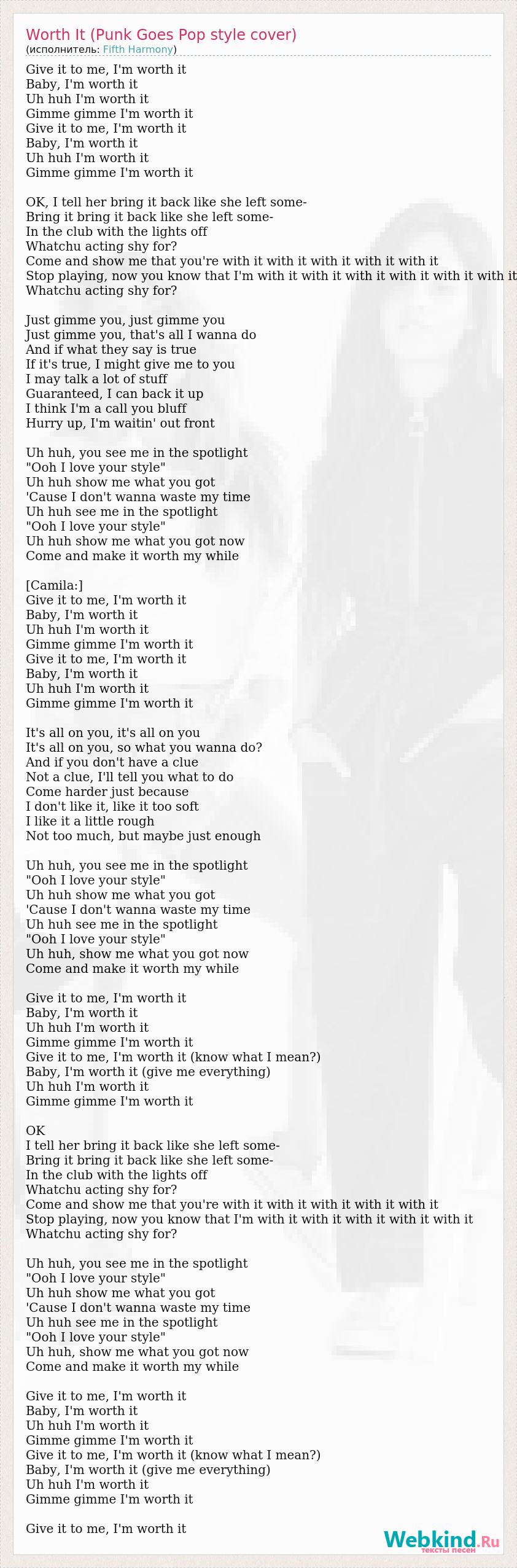 Give it to me, I'm worth it Baby, I'm worth it Uh huh I'm worth it Gimme gimme I'm worth it Give it to me, I'm worth it Baby, I'm worth it Uh huh I'm worth it Gimme gimme I'm worth it OK, I tell her bring it back like she left some- Bring it bring it back like she left some- In the club with the lights off Whatchu acting shy for? Come and show me that you're with it with it with it with it with it Stop playing, now you know that I'm with it with it with it with it with it with it Whatchu acting shy for? Just gimme you, just gimme you Just gimme you, that's all I wanna do And if what they say is true If it's true, I might give me to you I may talk a lot of stuff Guaranteed, I can back it up I think I'm a call you bluff Hurry up, I'm waitin' out front Uh huh, you see me in the spotlight "Ooh I love your style" Uh huh show me what you got 'Cause I don't wanna waste my time Uh huh see me in the spotlight "Ooh I love your style" Uh huh show me what you got now Come and make it worth my while [Camila:] Give it to me, I'm worth it Baby, I'm worth it Uh huh I'm worth it Gimme gimme I'm worth it Give it to me, I'm worth it Baby, I'm worth it Uh huh I'm worth it Gimme gimme I'm worth it It's all on you, it's all on you It's all on you, so what you wanna do? And if you don't have a clue Not a clue, I'll tell you what to do Come harder just because I don't like it, like it too soft I like it a little rough Not too much, but maybe just enough Uh huh, you see me in the spotlight "Ooh I love your style" Uh huh show me what you got 'Cause I don't wanna waste my time Uh huh see me in the spotlight "Ooh I love your style" Uh huh, show me what you got now Come and make it worth my while Give it to me, I'm worth it Baby, I'm worth it Uh huh I'm worth it Gimme gimme I'm worth it Give it to me, I'm worth it (know what I mean?) Baby, I'm worth it (give me everything) Uh huh I'm worth it Gimme gimme I'm worth it OK I tell her bring it back like she left some- Bring it bring it back like she left some- In the club with the lights off Whatchu acting shy for? Come and show me that you're with it with it with it with it with it Stop playing, now you know that I'm with it with it with it with it with it Whatchu acting shy for? Uh huh, you see me in the spotlight "Ooh I love your style" Uh huh show me what you got 'Cause I don't wanna waste my time Uh huh see me in the spotlight "Ooh I love your style" Uh huh, show me what you got now Come and make it worth my while Give it to me, I'm worth it Baby, I'm worth it Uh huh I'm worth it Gimme gimme I'm worth it Give it to me, I'm worth it (know what I mean?) Baby, I'm worth it (give me everything) Uh huh I'm worth it Gimme gimme I'm worth it Give it to me, I'm worth it
