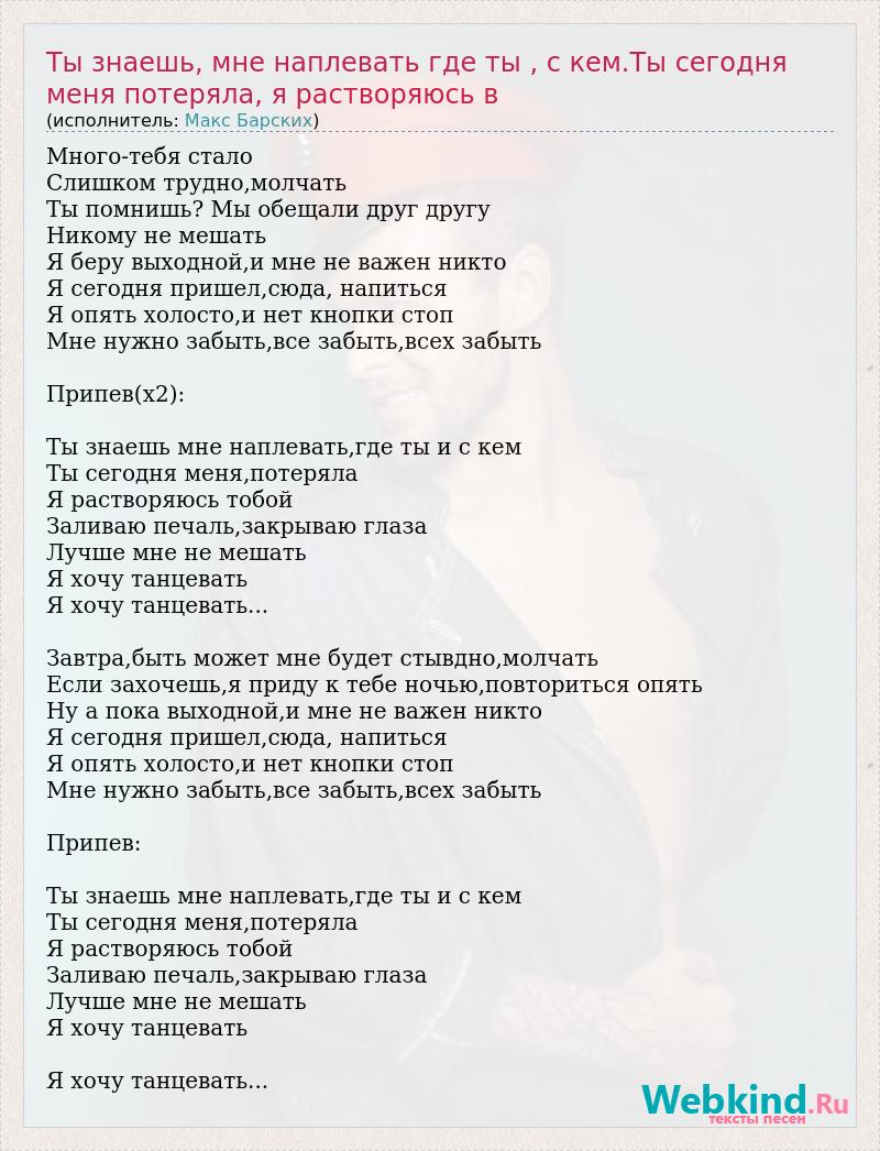 Главная→Исполнители→Макс Барских→Ты знаешь, мне наплевать где ты , с кем.Ты сегодня меня потеряла, я раств
