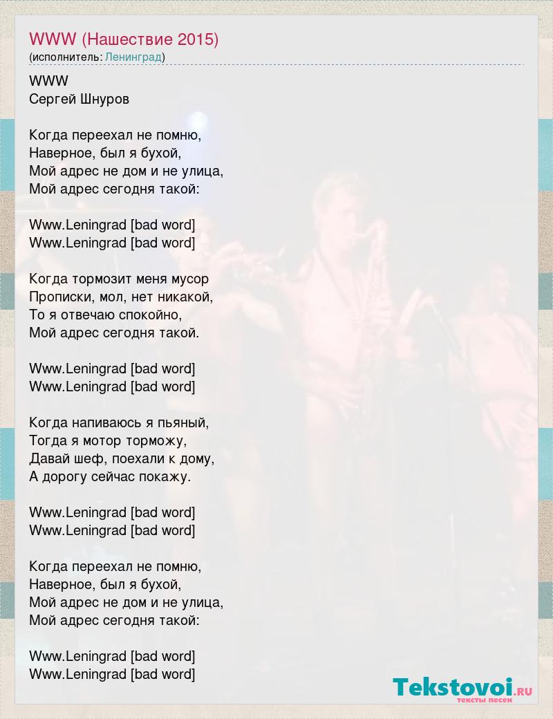 WWW Сергей Шнуров Когда переехал не помню, Наверное, был я бухой, Мой адрес не дом и не улица, Мой адрес сегодня такой: Www.Leningrad SPb.Точка ru. Www.Leningrad SPb.Точка ru. Когда тормозит меня мусор Прописки, мол, нет никакой, То я отвечаю спокойно, Мой адрес сегодня такой. Www.Leningrad SPb.Точка ru. Www.Leningrad SPb.Точка ru. Когда напиваюсь я пьяный, Тогда я мотор торможу, Давай шеф, поехали к дому, А дорогу сейчас покажу. Www.Leningrad SPb.Точка ru. Www.Leningrad SPb.Точка ru. Когда переехал не помню, Наверное, был я бухой, Мой адрес не дом и не улица, Мой адрес сегодня такой: Www.Leningrad SPb.Точка ru. Www.Leningrad SPb.Точка ru.
