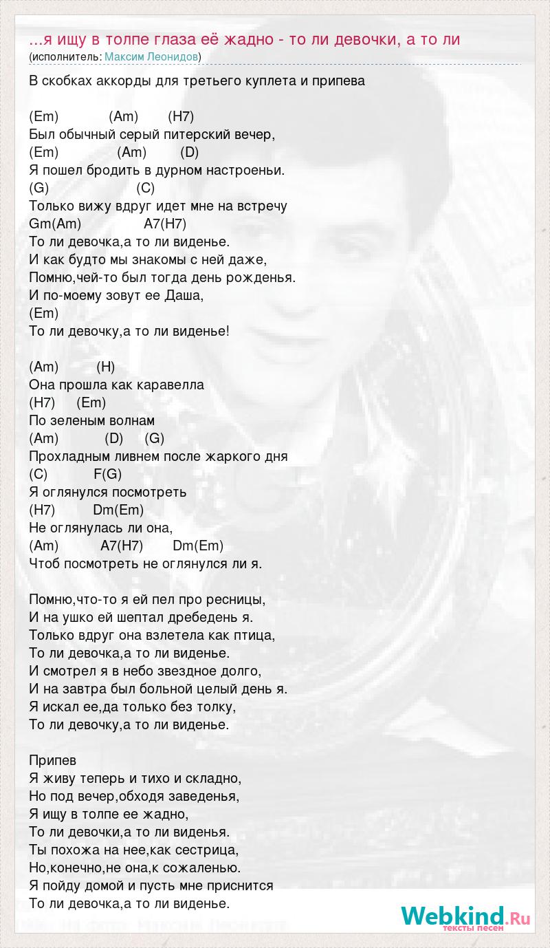В скобках аккорды для третьего куплета и припева (Em) (Am) (H7) Был обычный серый питерский вечер, (Em) (Am) (D) Я пошел бродить в дурном настроеньи. (G) (C) Только вижу вдруг идет мне на встречу Gm(Am) A7(H7) То ли девочка,а то ли виденье. И как будто мы знакомы с ней даже, Помню,чей-то был тогда день рожденья. И по-моему зовут ее Даша, (Em) То ли девочку,а то ли виденье! (Am) (H) Она прошла как каравелла (H7) (Em) По зеленым волнам (Am) (D) (G) Прохладным ливнем после жаркого дня (C) F(G) Я оглянулся посмотреть (H7) Dm(Em) Не оглянулась ли она, (Am) A7(H7) Dm(Em) Чтоб посмотреть не оглянулся ли я. Помню,что-то я ей пел про ресницы, И на ушко ей шептал дребедень я. Только вдруг она взлетела как птица, То ли девочка,а то ли виденье. И смотрел я в небо звездное долго, И на завтра был больной целый день я. Я искал ее,да только без толку, То ли девочку,а то ли виденье. Припев Я живу теперь и тихо и складно, Но под вечер,обходя заведенья, Я ищу в толпе ее жадно, То ли девочки,а то ли виденья. Ты похожа на нее,как сестрица, Но,конечно,не она,к сожаленью. Я пойду домой и пусть мне приснится То ли девочка,а то ли виденье.