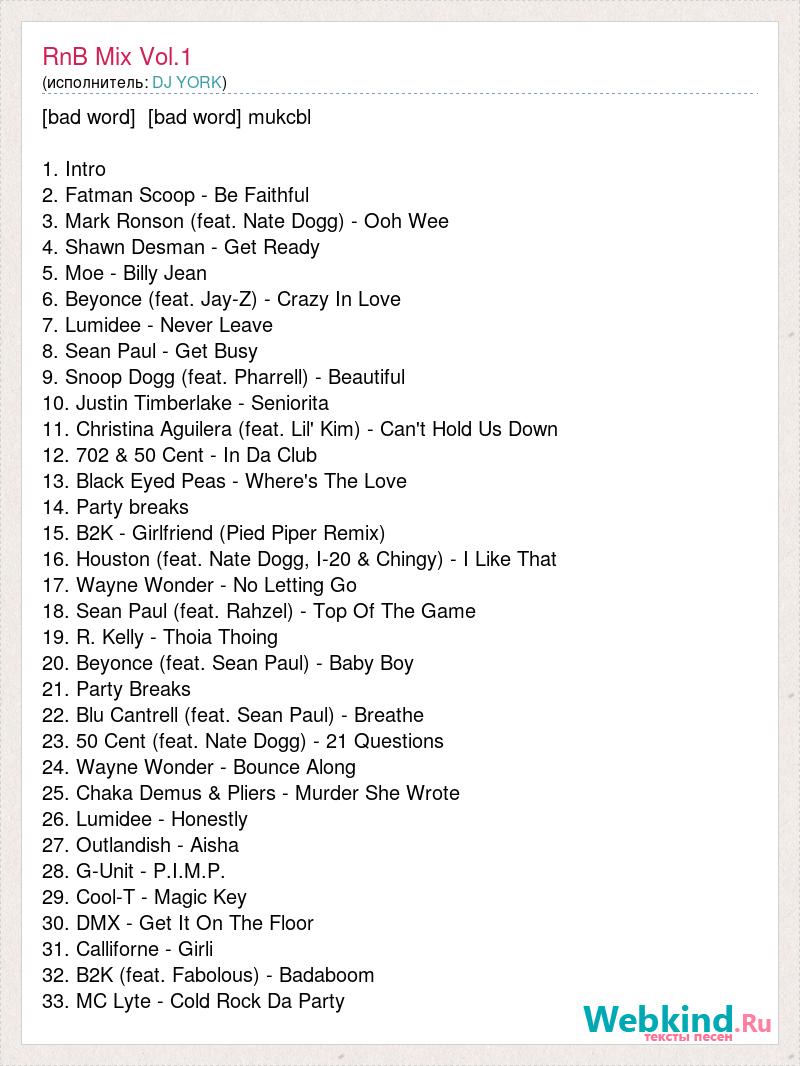 [bad word] [bad word] mukcbl 1. Intro 2. Fatman Scoop - Be Faithful 3. Mark Ronson (feat. Nate Dogg) - Ooh Wee 4. Shawn Desman - Get Ready 5. Moe - Billy Jean 6. Beyonce (feat. Jay-Z) - Crazy In Love 7. Lumidee - Never Leave 8. Sean Paul - Get Busy 9. Snoop Dogg (feat. Pharrell) - Beautiful 10. Justin Timberlake - Seniorita 11. Christina Aguilera (feat. Lil' Kim) - Can't Hold Us Down 12. 702 & 50 Cent - In Da Club 13. Black Eyed Peas - Where's The Love 14. Party breaks 15. B2K - Girlfriend (Pied Piper Remix) 16. Houston (feat. Nate Dogg, I-20 & Chingy) - I Like That 17. Wayne Wonder - No Letting Go 18. Sean Paul (feat. Rahzel) - Top Of The Game 19. R. Kelly - Thoia Thoing 20. Beyonce (feat. Sean Paul) - Baby Boy 21. Party Breaks 22. Blu Cantrell (feat. Sean Paul) - Breathe 23. 50 Cent (feat. Nate Dogg) - 21 Questions 24. Wayne Wonder - Bounce Along 25. Chaka Demus & Pliers - Murder She Wrote 26. Lumidee - Honestly 27. Outlandish - Aisha 28. G-Unit - P.I.M.P. 29. Cool-T - Magic Key 30. DMX - Get It On The Floor 31. Calliforne - Girli 32. B2K (feat. Fabolous) - Badaboom 33. MC Lyte - Cold Rock Da Party