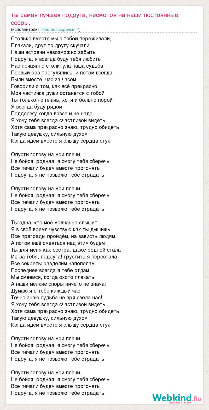 Столько вместе мы с тобой переживали, Плакали, друг по другу скучали Наши встречи невозможно забыть Подруга, я всегда буду тебя любить Нас нечаянно столкнула наша судьба Первый раз прогулялись, и потом всегда Были вместе, час за часом Говорили о том, как всё прекрасно. Моя частичка души останется с тобой Ты только не плачь, хотя и больно порой Я всегда буду рядом Поддержу когда вовсе и не надо Я хочу тебя всегда счастливой видеть Хотя сама прекрасно знаю, трудно обидеть Такую девушку, сильную духом Когда идём вместе я слышу сердца стук. Опусти голову на мои плечи, Не бойся, родная! я смогу тебя сберечь Все печали будем вместе прогонять Подруга, я не позволю тебе страдать Опусти голову на мои плечи, Не бойся, родная! я смогу тебя сберечь Все печали будем вместе прогонять Подруга, я не позволю тебе страдать Ты одна, кто моё молчанье слышит Я в своё время чувствую как ты дышишь Все преграды пройдём, на зависть людям А потом ещё смеяться над этим будем Ты для меня как сестра, даже родней стала Из-за тебя, подруга! грустить я перестала Все секреты разделим напополам Последнее всегда я тебе отдам Мы смеемся, когда охото плакать А наши мелкие споры ничего не значат Думаю я о тебе каждый час Точно знаю судьба не зря свела нас! Я хочу тебя всегда счастливой видеть Хотя сама прекрасно знаю, трудно обидеть Такую девушку, сильную духом Когда идём вместе я слышу сердца стук. Опусти голову на мои плечи, Не бойся, родная! я смогу тебя сберечь Все печали будем вместе прогонять Подруга, я не позволю тебе страдать Опусти голову на мои плечи, Не бойся, родная! я смогу тебя сберечь Все печали будем вместе прогонять Подруга, я не позволю тебе страдать