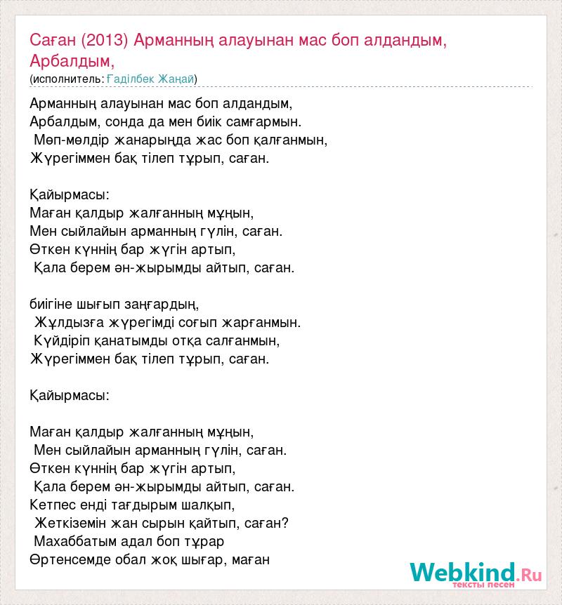 Арманның алауынан мас боп алдандым, Арбалдым, сонда да мен биік самғармын. Мөп-мөлдір жанарыңда жас боп қалғанмын, Жүрегіммен бақ тілеп тұрып, саған. Қайырмасы: Маған қалдыр жалғанның мұңын, Мен сыйлайын арманның гүлін, саған. Өткен күннің бар жүгін артып, Қала берем ән-жырымды айтып, саған. биігіне шығып заңғардың, Жұлдызға жүрегімді соғып жарғанмын. Күйдіріп қанатымды отқа салғанмын, Жүрегіммен бақ тілеп тұрып, саған. Қайырмасы: Маған қалдыр жалғанның мұңын, Мен сыйлайын арманның гүлін, саған. Өткен күннің бар жүгін артып, Қала берем ән-жырымды айтып, саған. Кетпес енді тағдырым шалқып, Жеткіземін жан сырын қайтып, саған? Махаббатым адал боп тұрар Өртенсемде обал жоқ шығар, маған