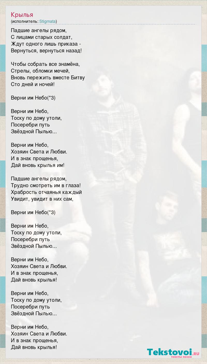 Падшие ангелы рядом, С лицами старых солдат, Ждут одного лишь приказа - Вернуться, вернуться назад! Чтобы собрать все знамёна, Стрелы, обломки мечей, Вновь пережить вместе Битву Сто дней и ночей! Верни им Небо(*3) Верни им Небо, Тоску по дому утоли, Посеребри путь Звёздной Пылью... Верни им Небо, Хозяин Света и Любви. И в знак прощенья, Дай вновь крылья им! Падшие ангелы рядом, Трудно смотреть им в глаза! Храбрость отчаянья каждый Увидит, увидит в них сам, Верни им Небо(*3) Верни им Небо, Тоску по дому утоли, Посеребри путь Звёздной Пылью... Верни им Небо, Хозяин Света и Любви. И в знак прощенья, Дай вновь крылья! Верни им Небо, Тоску по дому утоли, Посеребри путь Звёздной Пылью... Верни им Небо, Хозяин Света и Любви. И в знак прощенья, Дай вновь крылья!
