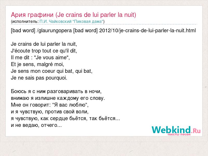 [bad word] /glaurungopera [bad word] 2012/10/je-crains-de-lui-parler-la-nuit.html Je crains de lui parler la nuit, J'écoute trop tout ce qu'il dit, Il me dit : "Je vous aime", Et je sens, malgré moi, Je sens mon coeur qui bat, qui bat, Je ne sais pas pourquoi. Боюсь я с ним разговаривать в ночи, внимаю я излишне каждому его слову. Мне он говорит: “Я вас люблю”, и я чувствую, против свой воли, я чувствую, как сердце бьётся, так бьётся... и не ведаю, отчего...