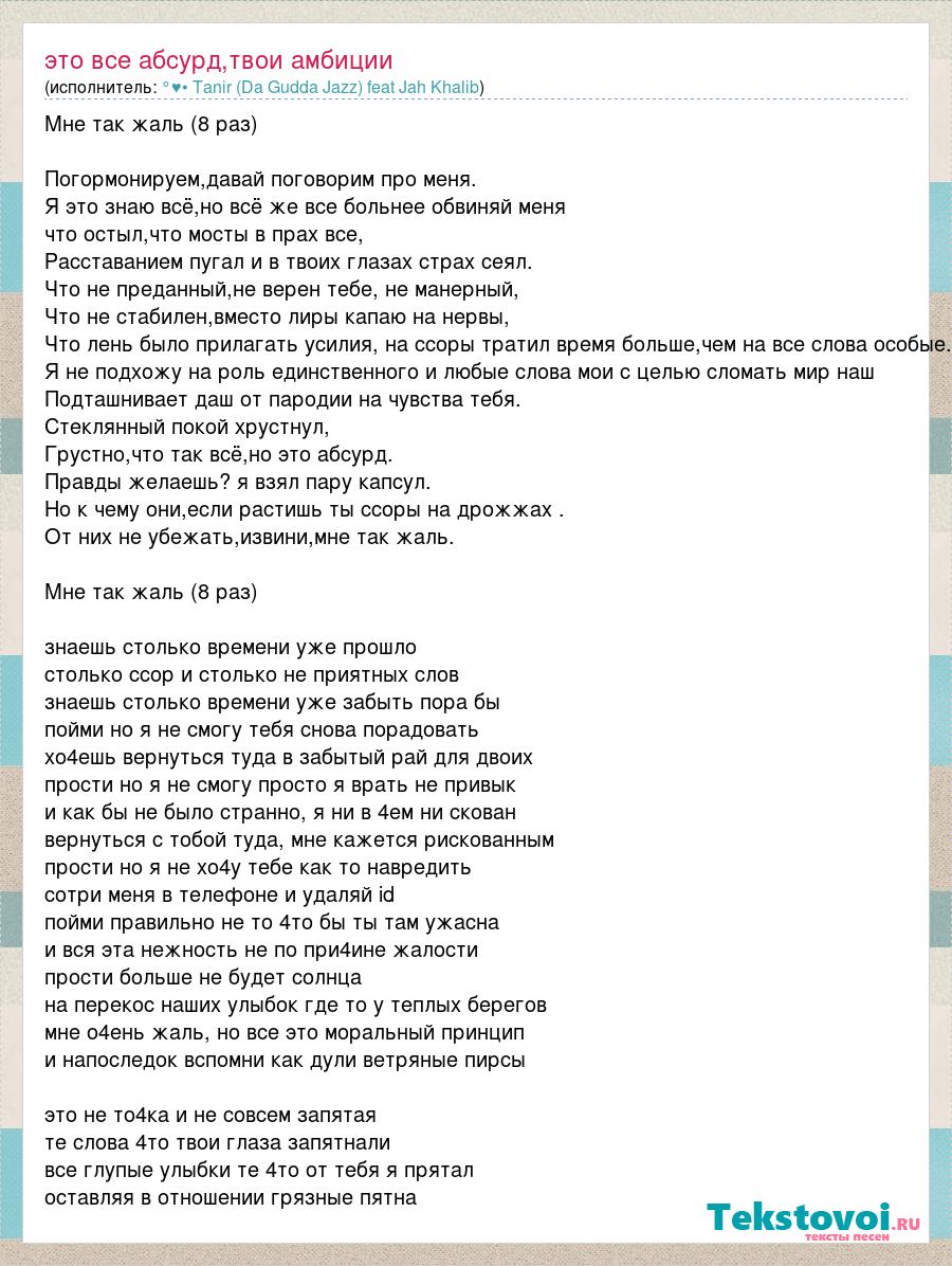 Мне так жаль (8 раз) Погормонируем,давай поговорим про меня. Я это знаю всё,но всё же все больнее обвиняй меня что остыл,что мосты в прах все, Расставанием пугал и в твоих глазах страх сеял. Что не преданный,не верен тебе, не манерный, Что не стабилен,вместо лиры капаю на нервы, Что лень было прилагать усилия, на ссоры тратил время больше,чем на все слова особые. Я не подхожу на роль единственного и любые слова мои с целью сломать мир наш Подташнивает даш от пародии на чувства тебя. Стеклянный покой хрустнул, Грустно,что так всё,но это абсурд. Правды желаешь? я взял пару капсул. Но к чему они,если растишь ты ссоры на дрожжах . От них не убежать,извини,мне так жаль. Мне так жаль (8 раз) знаешь столько времени уже прошло столько ссор и столько не приятных слов знаешь столько времени уже забыть пора бы пойми но я не смогу тебя снова порадовать хо4ешь вернуться туда в забытый рай для двоих прости но я не смогу просто я врать не привык и как бы не было странно, я ни в 4ем ни скован вернуться с тобой туда, мне кажется рискованным прости но я не хо4у тебе как то навредить сотри меня в телефоне и удаляй id пойми правильно не то 4то бы ты там ужасна и вся эта нежность не по при4ине жалости прости больше не будет солнца на перекос наших улыбок где то у теплых берегов мне о4ень жаль, но все это моральный принцип и напоследок вспомни как дули ветряные пирсы это не то4ка и не совсем запятая те слова 4то твои глаза запятнали все глупые улыбки те 4то от тебя я прятал оставляя в отношении грязные пятна