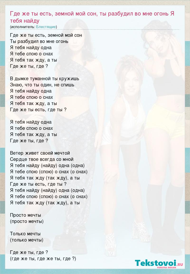 Где же ты есть, земной мой сон Ты разбудил во мне огонь Я тебя найду одна Я тебе спою о снах Я тебя так жду, а ты Где же ты, где ? В дымке туманной ты кружишь Знаю, что ты один, не спишь Я тебя найду одна Я тебе спою о снах Я тебя так жду, а ты Где же ты есть, где ты ? Я тебя найду одна Я тебе спою о снах Я тебя так жду, а ты Где же ты, где ? Ветер живет своей мечтой Сердце твое всегда со мной Я тебя найду (найду) одна (одна) Я тебе спою (спою) о снах (о снах) Я тебя так жду (так жду), а ты Где же ты есть, где ты ? Я тебя найду (найду) одна (одна) Я тебе спою (спою) о снах (о снах) Я тебя так жду (так жду), а ты Просто мечты (просто мечты) Только мечты (только мечты) Где же ты, где ? (где же ты, где же ты, где ?)