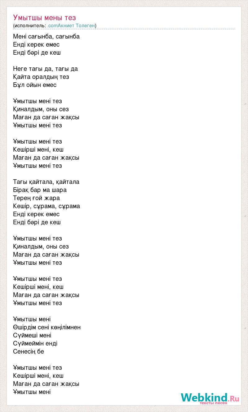 Мені сағынба, сағынба Енді керек емес Енді бәрі де кеш Неге тағы да, тағы да Қайта оралдың тез Бұл ойын емес Ұмытшы мені тез Қиналдым, оны сез Маған да саған жақсы Ұмытшы мені тез Ұмытшы мені тез Кешірші мені, кеш Маған да саған жақсы Ұмытшы мені тез Тағы қайтала, қайтала Бірақ бар ма шара Терең ғой жара Кешір, сұрама, сұрама Енді керек емес Енді бәрі де кеш Ұмытшы мені тез Қиналдым, оны сез Маған да саған жақсы Ұмытшы мені тез Ұмытшы мені тез Кешірші мені, кеш Маған да саған жақсы Ұмытшы мені тез Ұмытшы мені Өшірдім сені көңілімнен Сүймеші мені Сүймеймін енді Сенесің бе Ұмытшы мені тез Кешірші мені, кеш Маған да саған жақсы Ұмытшы мені