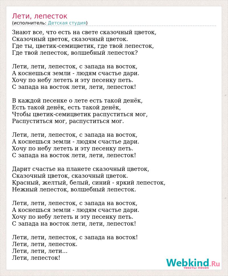 Знают все, что есть на свете сказочный цветок, Сказочный цветок, сказочный цветок. Где ты, цветик-семицветик, где твой лепесток, Где твой лепесток, волшебный лепесток? Лети, лети, лепесток, с запада на восток, А коснешься земли - людям счастье дари. Хочу по небу лететь и эту песенку петь. С запада на восток лети, лети, лепесток! В каждой песенке о лете есть такой денёк, Есть такой денёк, есть такой денёк, Чтобы цветик-семицветик распуститься мог, Распуститься мог, распуститься мог. Лети, лети, лепесток, с запада на восток, А коснешься земли - людям счастье дари. Хочу по небу лететь и эту песенку петь. С запада на восток лети, лети, лепесток! Дарит счастье на планете сказочный цветок, Сказочный цветок, сказочный цветок. Красный, желтый, белый, синий - яркий лепесток, Нежный лепесток, волшебный лепесток. Лети, лети, лепесток, с запада на восток, А коснешься земли - людям счастье дари. Хочу по небу лететь и эту песенку петь. С запада на восток лети, лети, лепесток! Лети, лети, лепесток, с запада на восток! Лети, лети, лепесток. Лети, лети, лети... Лети, лепесток!