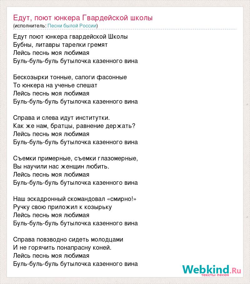 Едут поют юнкера гвардейской Школы Бубны, литавры тарелки гремят Лейсь песнь моя любимая Буль-буль-буль бутылочка казенного вина Бескозырки тонные, сапоги фасонные То юнкера на ученье спешат Лейсь песнь моя любимая Буль-буль-буль бутылочка казенного вина Справа и слева идут институтки. Как же нам, братцы, равнение держать? Лейсь песнь моя любимая Буль-буль-буль бутылочка казенного вина Съемки примерные, съемки глазомерные, Вы научили нас женщин любить. Лейсь песнь моя любимая Буль-буль-буль бутылочка казенного вина Наш эскадронный скомандовал «смирно!» Ручку свою приложил к козырьку Лейсь песнь моя любимая Буль-буль-буль бутылочка казенного вина Справа повзводно сидеть молодцами И не горячить понапрасну коней. Лейсь песнь моя любимая Буль-буль-буль бутылочка казенного вина