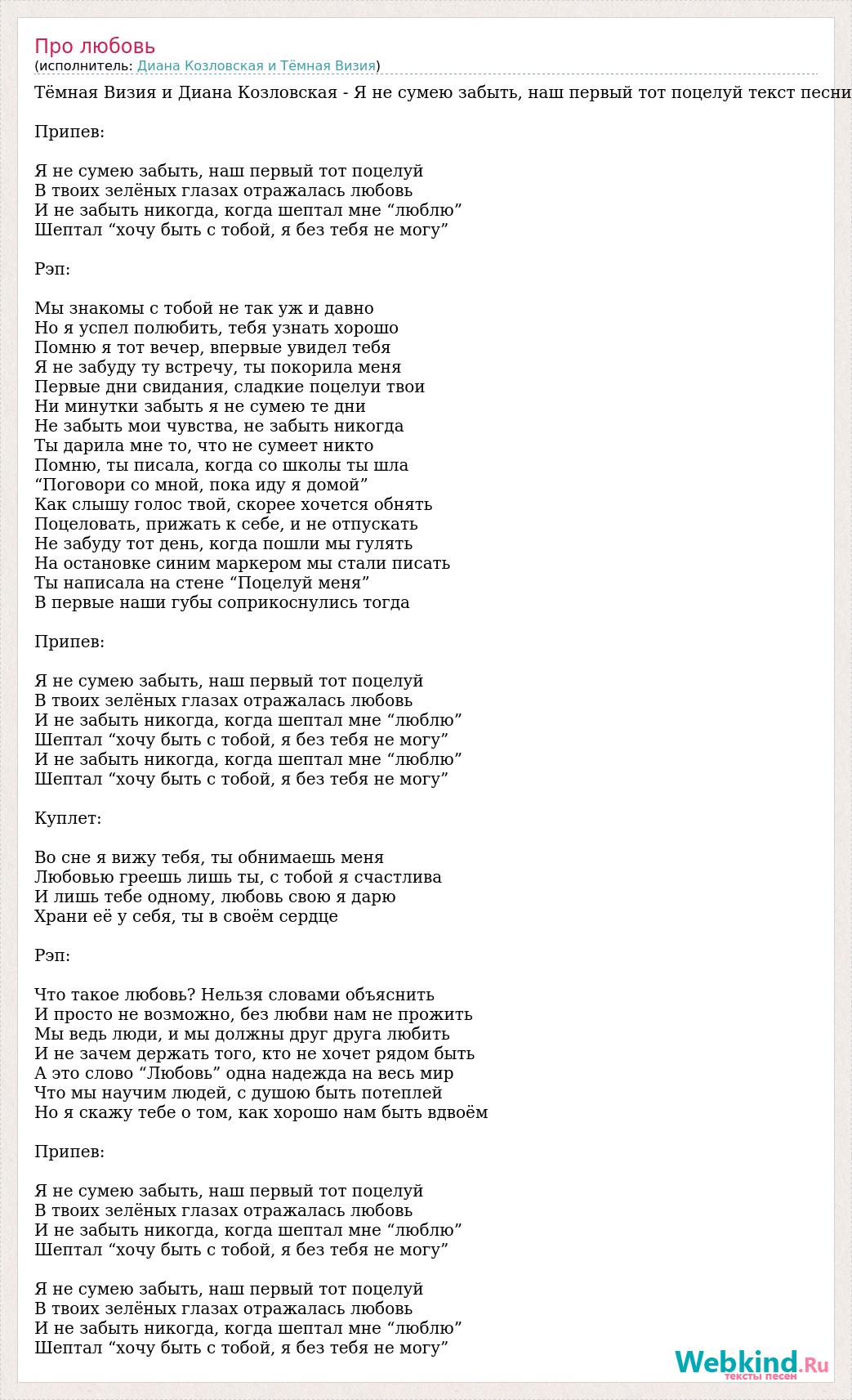 Тёмная Визия и Диана Козловская - Я не сумею забыть, наш первый тот поцелуй текст песни Припев: Я не сумею забыть, наш первый тот поцелуй В твоих зелёных глазах отражалась любовь И не забыть никогда, когда шептал мне “люблю” Шептал “хочу быть с тобой, я без тебя не могу” Рэп: Мы знакомы с тобой не так уж и давно Но я успел полюбить, тебя узнать хорошо Помню я тот вечер, впервые увидел тебя Я не забуду ту встречу, ты покорила меня Первые дни свидания, сладкие поцелуи твои Ни минутки забыть я не сумею те дни Не забыть мои чувства, не забыть никогда Ты дарила мне то, что не сумеет никто Помню, ты писала, когда со школы ты шла “Поговори со мной, пока иду я домой” Как слышу голос твой, скорее хочется обнять Поцеловать, прижать к себе, и не отпускать Не забуду тот день, когда пошли мы гулять На остановке синим маркером мы стали писать Ты написала на стене “Поцелуй меня” В первые наши губы соприкоснулись тогда Припев: Я не сумею забыть, наш первый тот поцелуй В твоих зелёных глазах отражалась любовь И не забыть никогда, когда шептал мне “люблю” Шептал “хочу быть с тобой, я без тебя не могу” И не забыть никогда, когда шептал мне “люблю” Шептал “хочу быть с тобой, я без тебя не могу” Куплет: Во сне я вижу тебя, ты обнимаешь меня Любовью греешь лишь ты, с тобой я счастлива И лишь тебе одному, любовь свою я дарю Храни её у себя, ты в своём сердце Рэп: Что такое любовь? Нельзя словами объяснить И просто не возможно, без любви нам не прожить Мы ведь люди, и мы должны друг друга любить И не зачем держать того, кто не хочет рядом быть А это слово “Любовь” одна надежда на весь мир Что мы научим людей, с душою быть потеплей Но я скажу тебе о том, как хорошо нам быть вдвоём Припев: Я не сумею забыть, наш первый тот поцелуй В твоих зелёных глазах отражалась любовь И не забыть никогда, когда шептал мне “люблю” Шептал “хочу быть с тобой, я без тебя не могу” Я не сумею забыть, наш первый тот поцелуй В твоих зелёных глазах отражалась любовь И не забыть никогда, когда шептал мне “люблю” Шептал “хочу быть с тобой, я без тебя не могу”