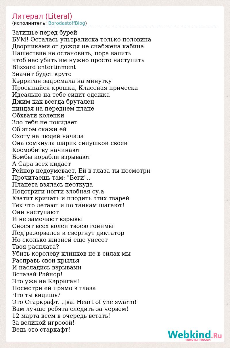 Затишье перед бурей БУМ! Осталась ультралиска только половина Дворниками от дождя не снабжена кабина Нашествие не остановить, пора валить чтоб нас убить им нужно просто наступить Blizzard entertinment Значит будет круто Кэрриган задремала на минутку Просыпайся крошка, Классная прическа Идеально на тебе сидит одежка Джим как всегда брутален ниндзя на переднем плане Обхвати коленки Зло тебя не покидает Об этом скажи ей Охоту на людей начала Она сомкнула шарик силушкой своей Космобитву начинают Бомбы корабли взрывают А Сара всех кидает Рейнор недоумевает, Ей в глаза ты посмотри Прочитаешь там: "Беги".. Планета взялась неоткуда Подстриги ногти злобная су.а Хватит кричать и плодить этих тварей Тех что летают и по танкам шагают! Они наступают И не замечают взрывы Сносят всех волей твоею гонимы Лед разорвался и свергнут диктатор Но сколько жизней еще унесет Твоя расплата? Убить королеву клинков не в силах мы Расправь свои крылья И насладись взрывами Вставай Рэйнор! Это уже не Кэрриган! Посмотри ей прямо в глаза Что ты видишь? Это Старкрафт. Два. Heart of yhe swarm! Вам лучше ребята следить за червем! 12 марта всем в очередь встать! За великой игрооой! Ведь это старкафт!