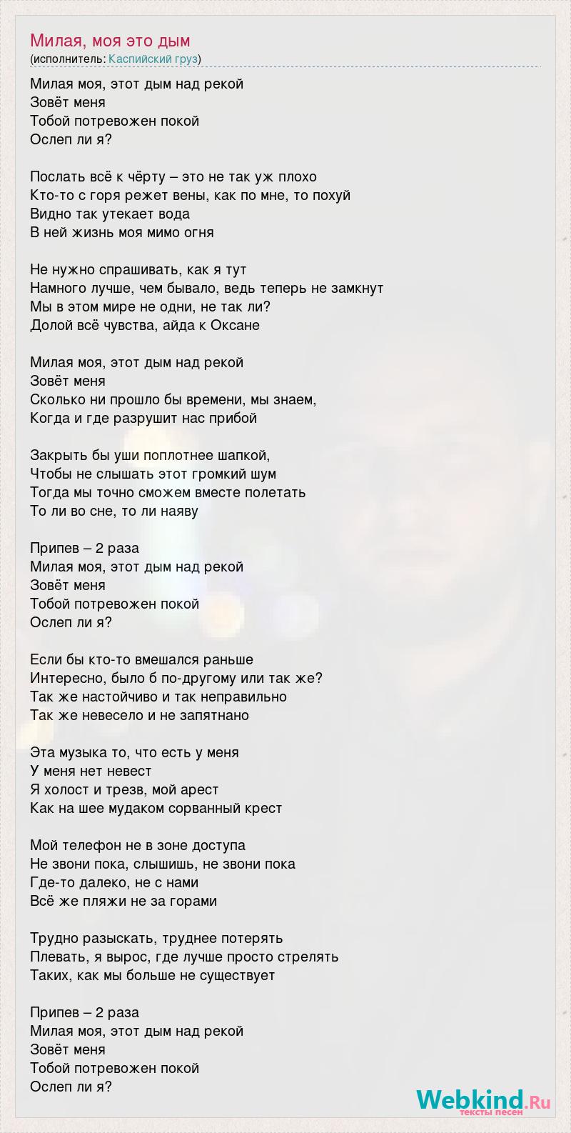 Милая моя, этот дым над рекой Зовёт меня Тобой потревожен покой Ослеп ли я? Послать всё к чёрту – это не так уж плохо Кто-то с горя режет вены, как по мне, то похуй Видно так утекает вода В ней жизнь моя мимо огня Не нужно спрашивать, как я тут Намного лучше, чем бывало, ведь теперь не замкнут Мы в этом мире не одни, не так ли? Долой всё чувства, айда к Оксане Милая моя, этот дым над рекой Зовёт меня Сколько ни прошло бы времени, мы знаем, Когда и где разрушит нас прибой Закрыть бы уши поплотнее шапкой, Чтобы не слышать этот громкий шум Тогда мы точно сможем вместе полетать То ли во сне, то ли наяву Припев – 2 раза Милая моя, этот дым над рекой Зовёт меня Тобой потревожен покой Ослеп ли я? Если бы кто-то вмешался раньше Интересно, было б по-другому или так же? Так же настойчиво и так неправильно Так же невесело и не запятнано Эта музыка то, что есть у меня У меня нет невест Я холост и трезв, мой арест Как на шее мудаком сорванный крест Мой телефон не в зоне доступа Не звони пока, слышишь, не звони пока Где-то далеко, не с нами Всё же пляжи не за горами Трудно разыскать, труднее потерять Плевать, я вырос, где лучше просто стрелять Таких, как мы больше не существует Припев – 2 раза Милая моя, этот дым над рекой Зовёт меня Тобой потревожен покой Ослеп ли я?