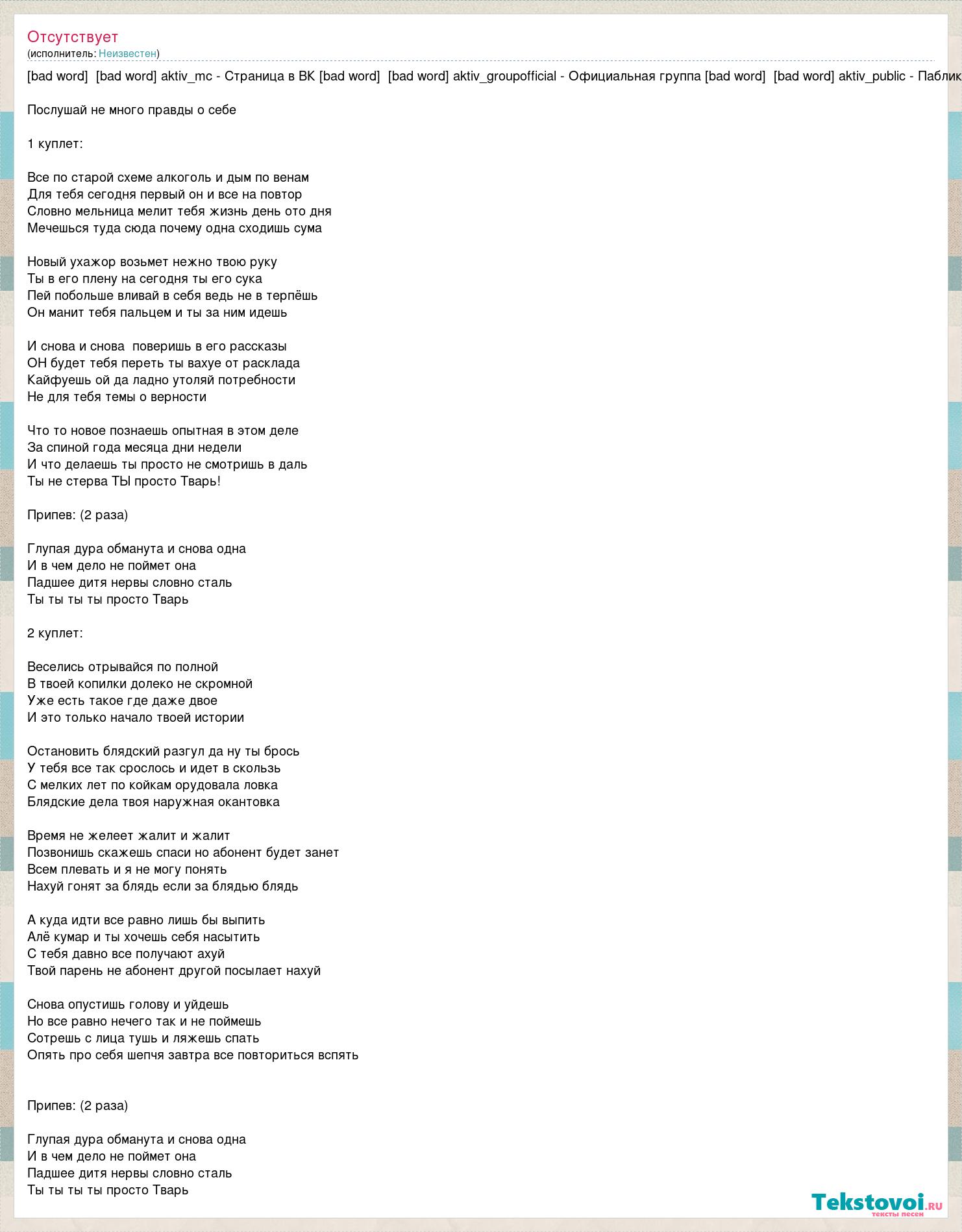 [bad word] [bad word] aktiv_mc - Страница в ВК [bad word] [bad word] aktiv_groupofficial - Официальная группа [bad word] [bad word] aktiv_public - Паблик Послушай не много правды о себе 1 куплет: Все по старой схеме алкоголь и дым по венам Для тебя сегодня первый он и все на повтор Словно мельница мелит тебя жизнь день ото дня Мечешься туда сюда почему одна сходишь сума Новый ухажор возьмет нежно твою руку Ты в его плену на сегодня ты его сука Пей побольше вливай в себя ведь не в терпёшь Он манит тебя пальцем и ты за ним идешь И снова и снова поверишь в его рассказы ОН будет тебя переть ты вахуе от расклада Кайфуешь ой да ладно утоляй потребности Не для тебя темы о верности Что то новое познаешь опытная в этом деле За спиной года месяца дни недели И что делаешь ты просто не смотришь в даль Ты не стерва ТЫ просто Тварь! Припев: (2 раза) Глупая дура обманута и снова одна И в чем дело не поймет она Падшее дитя нервы словно сталь Ты ты ты ты просто Тварь 2 куплет: Веселись отрывайся по полной В твоей копилки долеко не скромной Уже есть такое где даже двое И это только начало твоей истории Остановить блядский разгул да ну ты брось У тебя все так срослось и идет в скользь С мелких лет по койкам орудовала ловка Блядские дела твоя наружная окантовка Время не желеет жалит и жалит Позвонишь скажешь спаси но абонент будет занет Всем плевать и я не могу понять Нахуй гонят за блядь если за блядью блядь А куда идти все равно лишь бы выпить Алё кумар и ты хочешь себя насытить С тебя давно все получают ахуй Твой парень не абонент другой посылает нахуй Снова опустишь голову и уйдешь Но все равно нечего так и не поймешь Сотрешь с лица тушь и ляжешь спать Опять про себя шепчя завтра все повториться вспять Припев: (2 раза) Глупая дура обманута и снова одна И в чем дело не поймет она Падшее дитя нервы словно сталь Ты ты ты ты просто Тварь