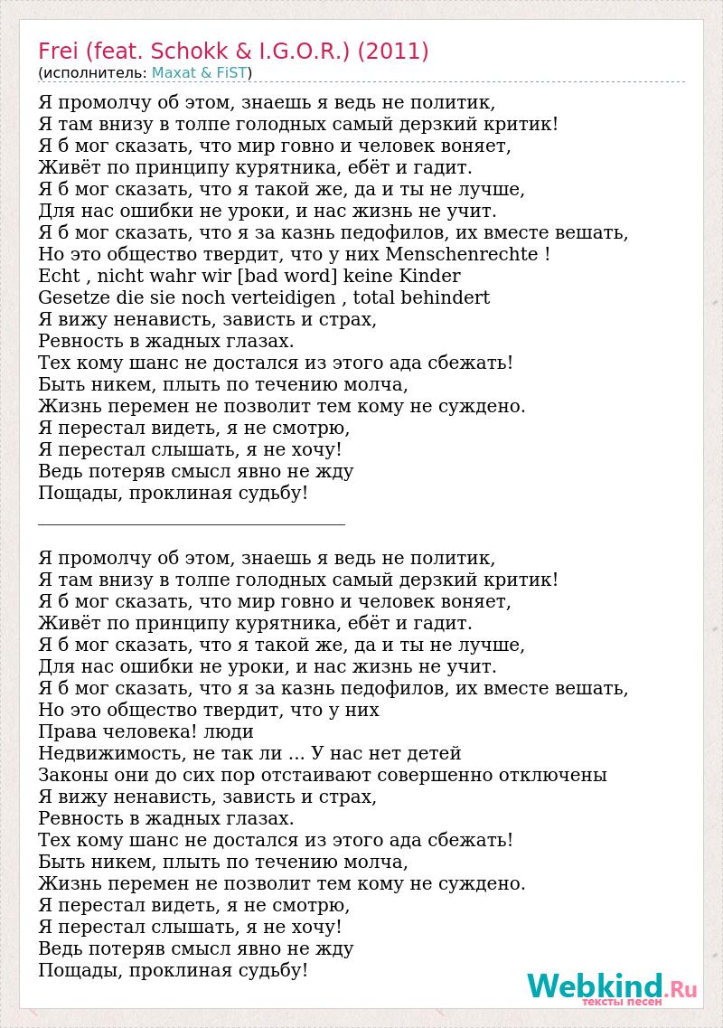 Я промолчу об этом, знаешь я ведь не политик, Я там внизу в толпе голодных самый дерзкий критик! Я б мог сказать, что мир говно и человек воняет, Живёт по принципу курятника, ебёт и гадит. Я б мог сказать, что я такой же, да и ты не лучше, Для нас ошибки не уроки, и нас жизнь не учит. Я б мог сказать, что я за казнь педофилов, их вместе вешать, Но это общество твердит, что у них Menschenrechte ! Echt , nicht wahr wir [bad word] keine Kinder Gesetze die sie noch verteidigen , total behindert Я вижу ненависть, зависть и страх, Ревность в жадных глазах. Тех кому шанс не достался из этого ада сбежать! Быть никем, плыть по течению молча, Жизнь перемен не позволит тем кому не суждено. Я перестал видеть, я не смотрю, Я перестал слышать, я не хочу! Ведь потеряв смысл явно не жду Пощады, проклиная судьбу! __________________________________ Я промолчу об этом, знаешь я ведь не политик, Я там внизу в толпе голодных самый дерзкий критик! Я б мог сказать, что мир говно и человек воняет, Живёт по принципу курятника, ебёт и гадит. Я б мог сказать, что я такой же, да и ты не лучше, Для нас ошибки не уроки, и нас жизнь не учит. Я б мог сказать, что я за казнь педофилов, их вместе вешать, Но это общество твердит, что у них Права человека! люди Недвижимость, не так ли ... У нас нет детей Законы они до сих пор отстаивают совершенно отключены Я вижу ненависть, зависть и страх, Ревность в жадных глазах. Тех кому шанс не достался из этого ада сбежать! Быть никем, плыть по течению молча, Жизнь перемен не позволит тем кому не суждено. Я перестал видеть, я не смотрю, Я перестал слышать, я не хочу! Ведь потеряв смысл явно не жду Пощады, проклиная судьбу!