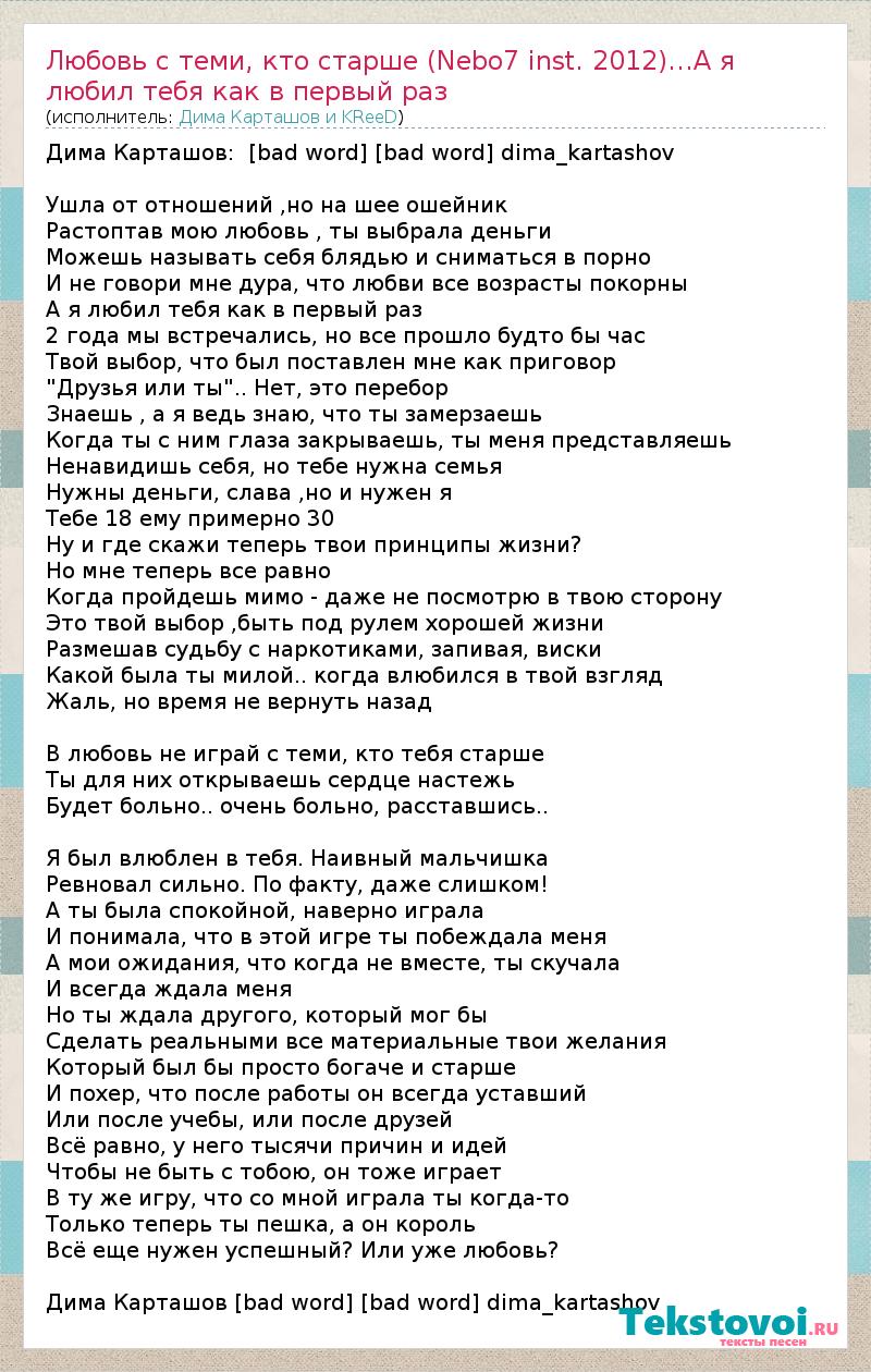 Главная→Исполнители→Дима Карташов и KReeD→Любовь с теми, кто старше (Nebo7 inst. 2012)...А я любил тебя как в перв