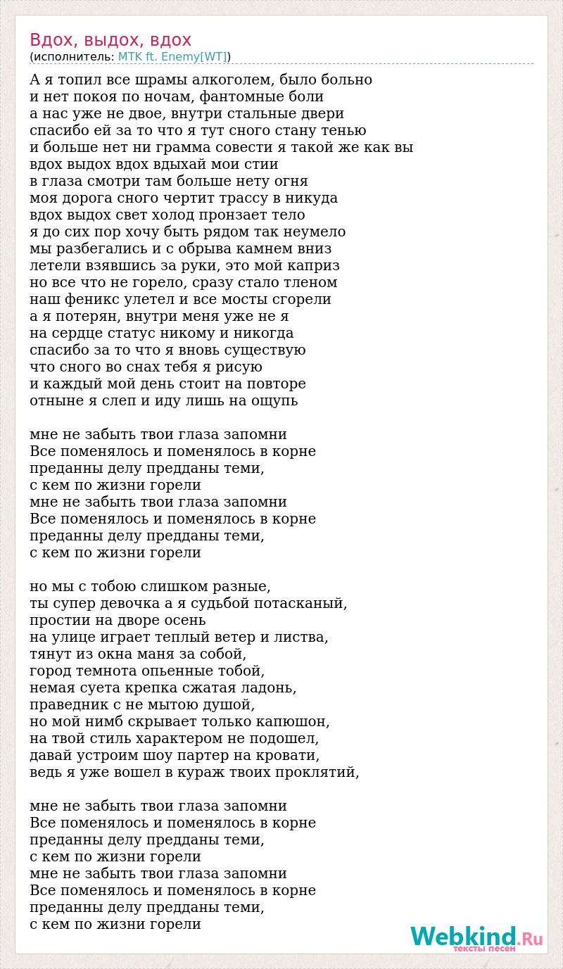 А я топил все шрамы алкоголем, было больно и нет покоя по ночам, фантомные боли а нас уже не двое, внутри стальные двери спасибо ей за то что я тут сного стану тенью и больше нет ни грамма совести я такой же как вы вдох выдох вдох вдыхай мои стии в глаза смотри там больше нету огня моя дорога сного чертит трассу в никуда вдох выдох свет холод пронзает тело я до сих пор хочу быть рядом так неумело мы разбегались и с обрыва камнем вниз летели взявшись за руки, это мой каприз но все что не горело, сразу стало тленом наш феникс улетел и все мосты сгорели а я потерян, внутри меня уже не я на сердце статус никому и никогда спасибо за то что я вновь существую что сного во снах тебя я рисую и каждый мой день стоит на повторе отныне я слеп и иду лишь на ощупь мне не забыть твои глаза запомни Все поменялось и поменялось в корне преданны делу предданы теми, c кем по жизни горели мне не забыть твои глаза запомни Все поменялось и поменялось в корне преданны делу предданы теми, c кем по жизни горели но мы с тобою слишком разные, ты супер девочка а я судьбой потасканый, простии на дворе осень на улице играет теплый ветер и листва, тянут из окна маня за собой, город темнота опьенные тобой, немая суета крепка сжатая ладонь, праведник с не мытою душой, но мой нимб скрывает только капюшон, на твой стиль характером не подошел, давай устроим шоу партер на кровати, ведь я уже вошел в кураж твоих проклятий, мне не забыть твои глаза запомни Все поменялось и поменялось в корне преданны делу предданы теми, c кем по жизни горели мне не забыть твои глаза запомни Все поменялось и поменялось в корне преданны делу предданы теми, c кем по жизни горели