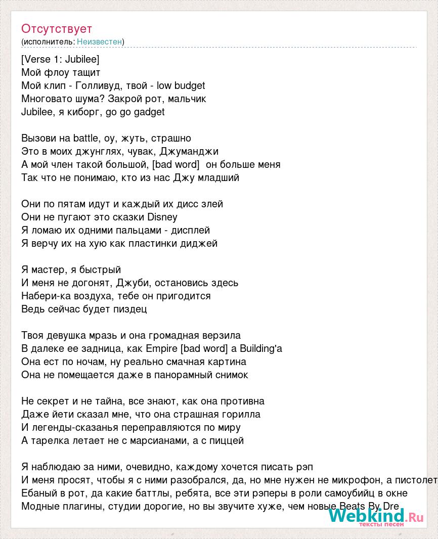 [Verse 1: Jubilee] Мой флоу тащит Мой клип - Голливуд, твой - low budget Многовато шума? Закрой рот, мальчик Jubilee, я киборг, go go gadget Вызови на battle, оу, жуть, страшно Это в моих джунглях, чувак, Джуманджи А мой член такой большой, [bad word] он больше меня Так что не понимаю, кто из нас Джу младший Они по пятам идут и каждый их дисс злей Они не пугают это сказки Disney Я ломаю их одними пальцами - дисплей Я верчу их на хую как пластинки диджей Я мастер, я быстрый И меня не догонят, Джуби, остановись здесь Набери-ка воздуха, тебе он пригодится Ведь сейчас будет пиздец Твоя девушка мразь и она громадная верзила В далеке ее задница, как Empire [bad word] а Building'а Она ест по ночам, ну реально смачная картина Она не помещается даже в панорамный снимок Не секрет и не тайна, все знают, как она противна Даже йети сказал мне, что она страшная горилла И легенды-сказанья переправляются по миру А тарелка летает не с марсианами, а с пиццей Я наблюдаю за ними, очевидно, каждому хочется писать рэп И меня просят, чтобы я с ними разобрался, да, но мне нужен не микрофон, а пистолет Ебаный в рот, да какие баттлы, ребята, все эти рэперы в роли самоубийц в окне Модные плагины, студии дорогие, но вы звучите хуже, чем новые Beats By Dre