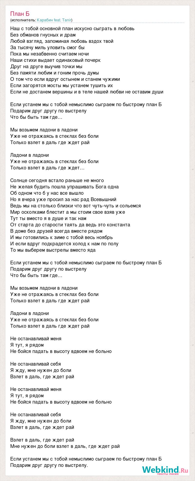 Наш с тобой основной план искусно сыграть в любовь Без обманов гнусных и драм Любой взгляд, запоминая любовь вздох твой За тысячу миль уловить смог бы Пока мы незабвенно считаем ночи Наши стихи выдает одинаковый почерк Друг на друге выучив точки мы Без памяти любим и гоним прочь думы О том что если вдруг остынем и станем чужими Если загорятся мосты мы устанем тушить их Если не достанем вершины и в теле нашей любви не оставим души Если устанем мы с тобой немыслимо сыграем по быстрому план Б Подарим друг другу по выстрелу Что бы быть там где… Мы возьмем ладони в ладони Уже не отражаясь в стеклах без боли Только взлет в даль где ждет рай Ладони в ладони Уже не отражаясь в стеклах без боли Только взлет в даль где ждет… Солнце сегодня встало раньше не много Не желая будить пошла упрашивать Бога одна Об одном что б у нас все вышло Но я вчера уже просил за нас рад Всевышний Ведь мы на столько близки что вот чуть-чуть и сольемся Мир осколками блестит а мы стоим свое взяв уже Тут ты вместо я в душе и так нам От старта до старости таять да ведь это константа В доме без друзей всегда вместе рядом И мы готовились к зиме с тобой весь ноябрь И если вдруг подкрадется холод к нам по полу То мы выберем выстрелы вместо яда Если устанем мы с тобой немыслимо сыграем по быстрому план Б Подарим друг другу по выстрелу Что бы быть там где… Мы возьмем ладони в ладони Уже не отражаясь в стеклах без боли Только взлет в даль где ждет рай Ладони в ладони Уже не отражаясь в стеклах без боли Только взлет в даль где ждет рай Не останавливай меня Я тут, я рядом Не бойся падать в высоту вдвоем не больно Не останавливай себя Я жду, мне нужен до боли Взлет в даль, где ждет рай Не останавливай меня Я тут, я рядом Не бойся падать в высоту вдвоем не больно Не останавливай себя Я жду, мне нужен до боли Взлет в даль, где ждет рай Взлет в даль, где ждет рай Мне нужен до боли взлет в даль, где ждет рай Если устанем мы с тобой немыслимо сыграем по быстрому план Б Подарим друг другу по выстрелу.