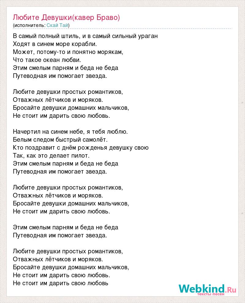 В самый полный штиль, и в самый сильный ураган Ходят в синем море корабли. Может, потому-то и понятно морякам, Что такое океан любви. Этим смелым парням и беда не беда Путеводная им помогает звезда. Любите девушки простых романтиков, Отважных лётчиков и моряков. Бросайте девушки домашних мальчиков, Не стоит им дарить свою любовь. Начертил на синем небе, я тебя люблю. Белым следом быстрый самолёт. Кто поздравит с днём рожденья девушку свою Так, как это делает пилот. Этим смелым парням и беда не беда Путеводная им помогает звезда. Любите девушки простых романтиков, Отважных лётчиков и моряков. Бросайте девушки домашних мальчиков, Не стоит им дарить свою любовь. Этим смелым парням и беда не беда Путеводная им помогает звезда. Любите девушки простых романтиков, Отважных лётчиков и моряков. Бросайте девушки домашних мальчиков, Не стоит им дарить свою любовь. Не стоит им дарить свою любовь