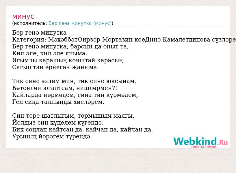 Бер генә минутка Категория: МәхәббәтФирзәр Мортазин көеДинә Камалетдинова сүзләре Бер генә минутка, барсын да оныт та, Кил әле, кил әле яныма. Ягымлы карашың кояштай карасың Сагыштан әрнегән җаныма. Тик сине эзлим мин, тик сине юксынам, Бөтенләй югалтсам, нишләрмен?! Кайларда йөрмәдем, сиңа тиң күрмәдем, Гел сиңа талпынды хисләрем. Син тере шатлыгым, тормышым маягы, Йолдыз син күңелем күгендә. Бик соңлап кайтсаң да, кайчан да, кайчан да, Урының йөрәгем түрендә.