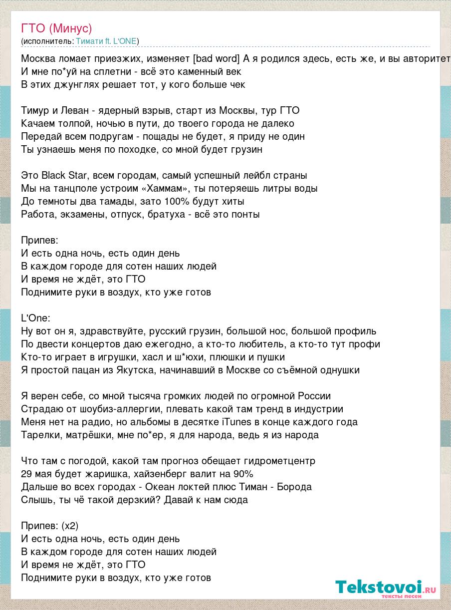 Москва ломает приезжих, изменяет [bad word] А я родился здесь, есть же, и вы авторитет И мне по*уй на сплетни - всё это каменный век В этих джунглях решает тот, у кого больше чек Тимур и Леван - ядерный взрыв, старт из Москвы, тур ГТО Качаем толпой, ночью в пути, до твоего города не далеко Передай всем подругам - пощады не будет, я приду не один Ты узнаешь меня по походке, со мной будет грузин Это Black Star, всем городам, самый успешный лейбл страны Мы на танцполе устроим «Хаммам», ты потеряешь литры воды До темноты два тамады, зато 100% будут хиты Работа, экзамены, отпуск, братуха - всё это понты Припев: И есть одна ночь, есть один день В каждом городе для сотен наших людей И время не ждёт, это ГТО Поднимите руки в воздух, кто уже готов L'One: Ну вот он я, здравствуйте, русский грузин, большой нос, большой профиль По двести концертов даю ежегодно, а кто-то любитель, а кто-то тут профи Кто-то играет в игрушки, хасл и ш*юхи, плюшки и пушки Я простой пацан из Якутска, начинавший в Москве со съёмной однушки Я верен себе, со мной тысяча громких людей по огромной России Страдаю от шоубиз-аллергии, плевать какой там тренд в индустрии Меня нет на радио, но альбомы в десятке iTunes в конце каждого года Тарелки, матрёшки, мне по*ер, я для народа, ведь я из народа Что там с погодой, какой там прогноз обещает гидрометцентр 29 мая будет жаришка, хайзенберг валит на 90% Дальше во всех городах - Океан локтей плюс Тиман - Борода Слышь, ты чё такой дерзкий? Давай к нам сюда Припев: (х2) И есть одна ночь, есть один день В каждом городе для сотен наших людей И время не ждёт, это ГТО Поднимите руки в воздух, кто уже готов