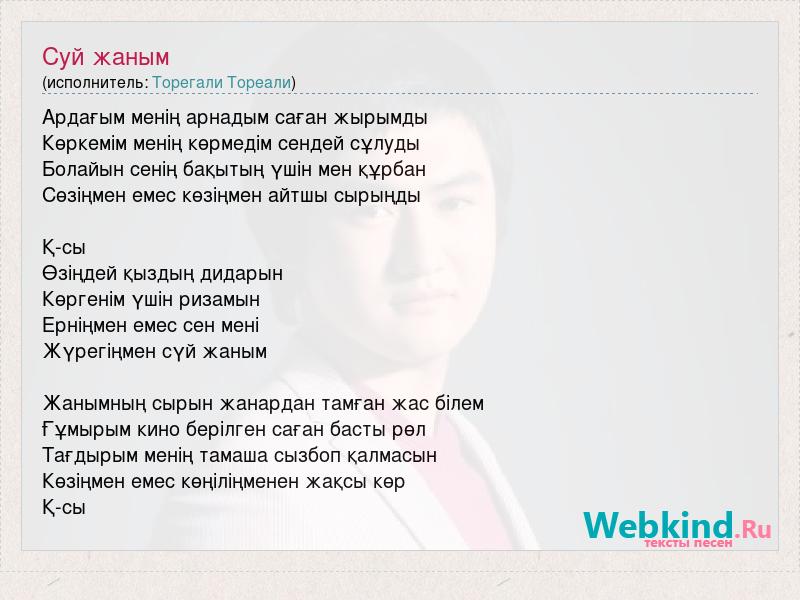 Ардағым менің арнадым саған жырымды Көркемім менің көрмедім сендей сұлуды Болайын сенің бақытың үшін мен құрбан Сөзіңмен емес көзіңмен айтшы сырыңды Қ-сы Өзіңдей қыздың дидарын Көргенім үшін ризамын Ерніңмен емес сен мені Жүрегіңмен сүй жаным Жанымның сырын жанардан тамған жас білем Ғұмырым кино берілген саған басты рөл Тағдырым менің тамаша сызбоп қалмасын Көзіңмен емес көңіліңменен жақсы көр Қ-сы