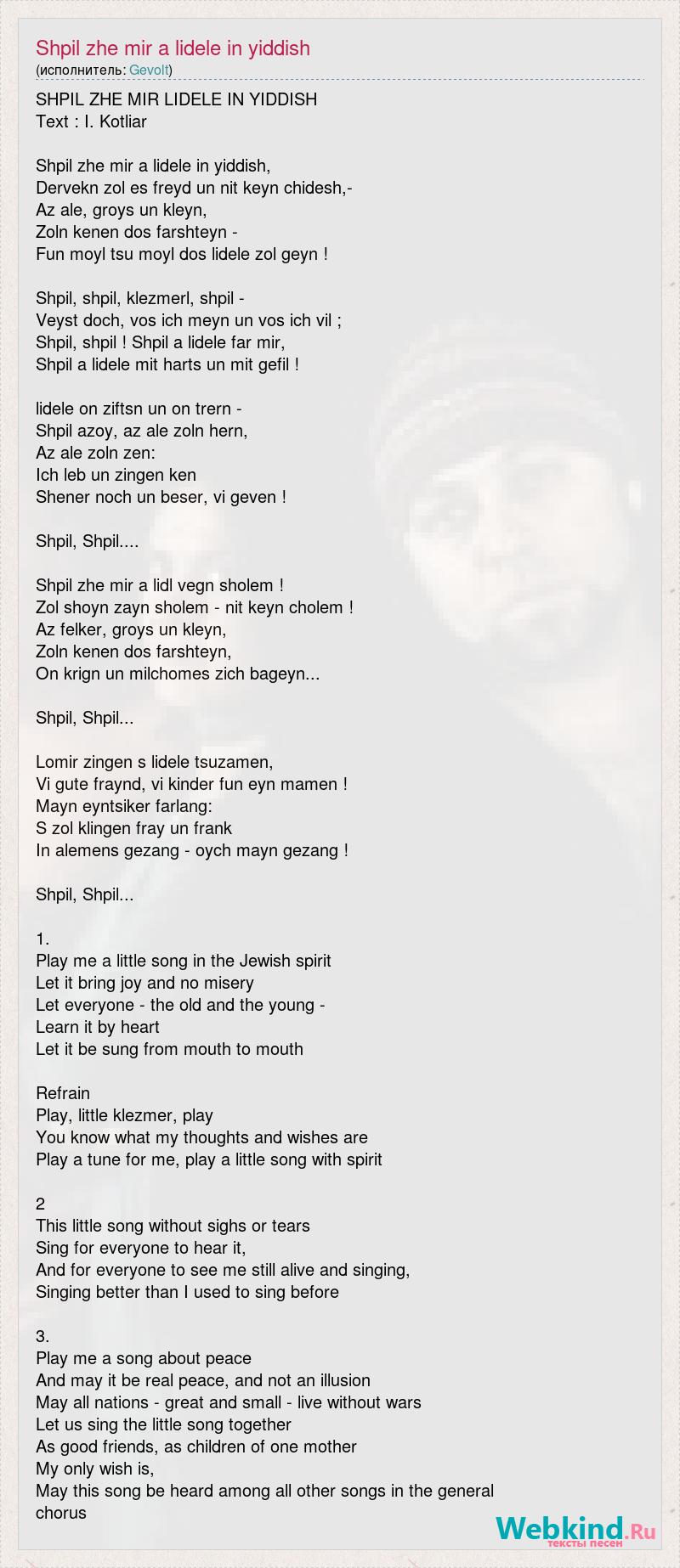 SHPIL ZHE MIR LIDELE IN YIDDISH Text : I. Kotliar Shpil zhe mir a lidele in yiddish, Dervekn zol es freyd un nit keyn chidesh,- Az ale, groys un kleyn, Zoln kenen dos farshteyn - Fun moyl tsu moyl dos lidele zol geyn ! Shpil, shpil, klezmerl, shpil - Veyst doch, vos ich meyn un vos ich vil ; Shpil, shpil ! Shpil a lidele far mir, Shpil a lidele mit harts un mit gefil ! lidele on ziftsn un on trern - Shpil azoy, az ale zoln hern, Az ale zoln zen: Ich leb un zingen ken Shener noch un beser, vi geven ! Shpil, Shpil.... Shpil zhe mir a lidl vegn sholem ! Zol shoyn zayn sholem - nit keyn cholem ! Az felker, groys un kleyn, Zoln kenen dos farshteyn, On krign un milchomes zich bageyn... Shpil, Shpil... Lomir zingen s lidele tsuzamen, Vi gute fraynd, vi kinder fun eyn mamen ! Mayn eyntsiker farlang: S zol klingen fray un frank In alemens gezang - oych mayn gezang ! Shpil, Shpil... 1. Play me a little song in the Jewish spirit Let it bring joy and no misery Let everyone - the old and the young - Learn it by heart Let it be sung from mouth to mouth Refrain Play, little klezmer, play You know what my thoughts and wishes are Play a tune for me, play a little song with spirit 2 This little song without sighs or tears Sing for everyone to hear it, And for everyone to see me still alive and singing, Singing better than I used to sing before 3. Play me a song about peace And may it be real peace, and not an illusion May all nations - great and small - live without wars Let us sing the little song together As good friends, as children of one mother My only wish is, May this song be heard among all other songs in the general chorus