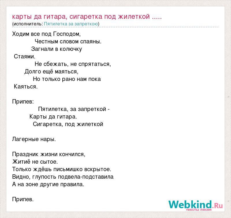 А как ты думаешь, о чем песня "Карты да гитара, сигаретка под жилеткой ....." ?