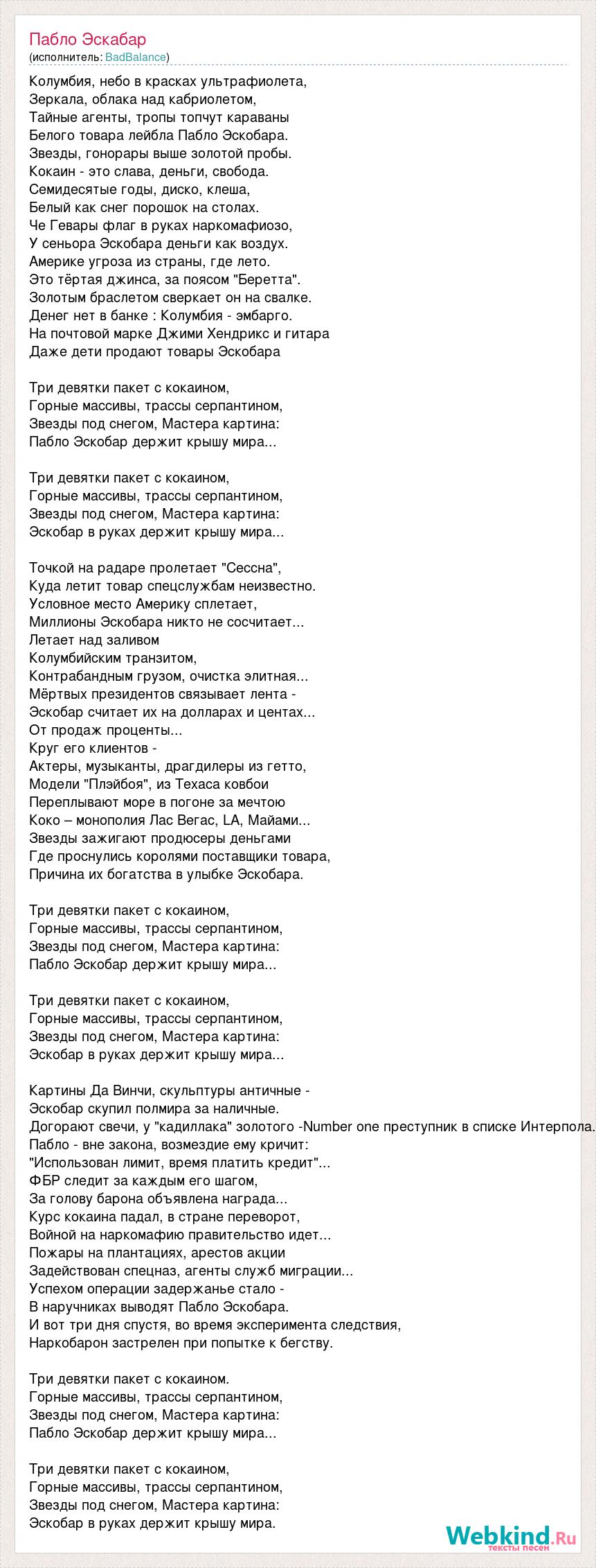 Колумбия, небо в красках ультрафиолета, Зеркала, облака над кабриолетом, Тайные агенты, тропы топчут караваны Белого товара лейбла Пабло Эскобара. Звезды, гонорары выше золотой пробы. Кокаин - это слава, деньги, свобода. Семидесятые годы, диско, клеша, Белый как снег порошок на столах. Че Гевары флаг в руках наркомафиозо, У сеньора Эскобара деньги как воздух. Америке угроза из страны, где лето. Это тёртая джинса, за поясом "Беретта". Золотым браслетом сверкает он на свалке. Денег нет в банке : Колумбия - эмбарго. На почтовой марке Джими Хендрикс и гитара Даже дети продают товары Эскобара Три девятки пакет с кокаином, Горные массивы, трассы серпантином, Звезды под снегом, Мастера картина: Пабло Эскобар держит крышу мира... Три девятки пакет с кокаином, Горные массивы, трассы серпантином, Звезды под снегом, Мастера картина: Эскобар в руках держит крышу мира... Точкой на радаре пролетает "Сессна", Куда летит товар спецслужбам неизвестно. Условное место Америку сплетает, Миллионы Эскобара никто не сосчитает... Летает над заливом Колумбийским транзитом, Контрабандным грузом, очистка элитная... Мёртвых президентов связывает лента - Эскобар считает их на долларах и центах... От продаж проценты... Круг его клиентов - Актеры, музыканты, драгдилеры из гетто, Модели "Плэйбоя", из Техаса ковбои Переплывают море в погоне за мечтою Коко – монополия Лас Вегас, LA, Майами... Звезды зажигают продюсеры деньгами Где проснулись королями поставщики товара, Причина их богатства в улыбке Эскобара. Три девятки пакет с кокаином, Горные массивы, трассы серпантином, Звезды под снегом, Мастера картина: Пабло Эскобар держит крышу мира... Три девятки пакет с кокаином, Горные массивы, трассы серпантином, Звезды под снегом, Мастера картина: Эскобар в руках держит крышу мира... Картины Да Винчи, скульптуры античные - Эскобар скупил полмира за наличные. Догорают свечи, у "кадиллака" золотого -Number one преступник в списке Интерпола. Пабло - вне закона, возмездие ему кричит: "Использован лимит, время платить кредит"... ФБР следит за каждым его шагом, За голову барона объявлена награда... Курс кокаина падал, в стране переворот, Войной на наркомафию правительство идет... Пожары на плантациях, арестов акции Задействован спецназ, агенты служб миграции... Успехом операции задержанье стало - В наручниках выводят Пабло Эскобара. И вот три дня спустя, во время эксперимента следствия, Наркобарон застрелен при попытке к бегству. Три девятки пакет с кокаином. Горные массивы, трассы серпантином, Звезды под снегом, Мастера картина: Пабло Эскобар держит крышу мира... Три девятки пакет с кокаином, Горные массивы, трассы серпантином, Звезды под снегом, Мастера картина: Эскобар в руках держит крышу мира.