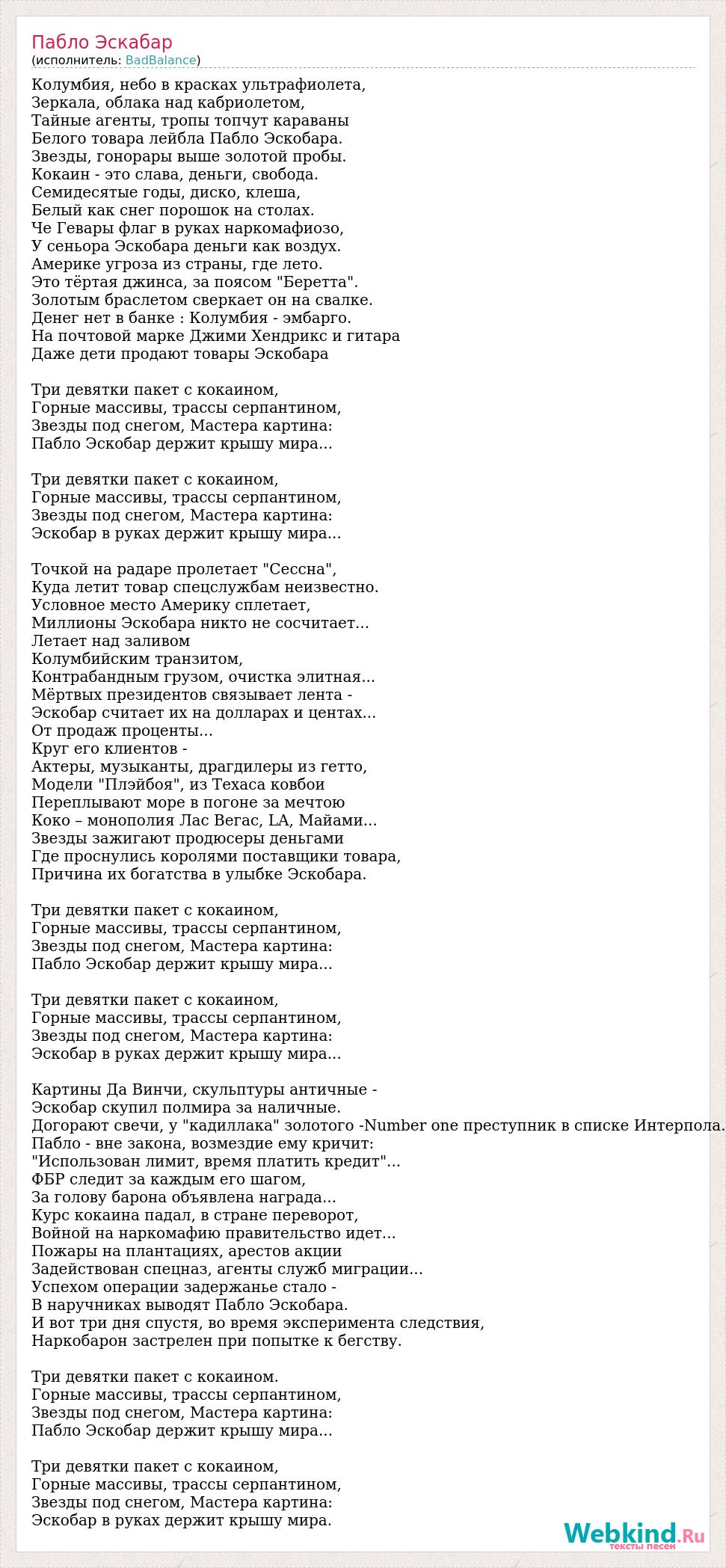 Колумбия, небо в красках ультрафиолета, Зеркала, облака над кабриолетом, Тайные агенты, тропы топчут караваны Белого товара лейбла Пабло Эскобара. Звезды, гонорары выше золотой пробы. Кокаин - это слава, деньги, свобода. Семидесятые годы, диско, клеша, Белый как снег порошок на столах. Че Гевары флаг в руках наркомафиозо, У сеньора Эскобара деньги как воздух. Америке угроза из страны, где лето. Это тёртая джинса, за поясом "Беретта". Золотым браслетом сверкает он на свалке. Денег нет в банке : Колумбия - эмбарго. На почтовой марке Джими Хендрикс и гитара Даже дети продают товары Эскобара Три девятки пакет с кокаином, Горные массивы, трассы серпантином, Звезды под снегом, Мастера картина: Пабло Эскобар держит крышу мира... Три девятки пакет с кокаином, Горные массивы, трассы серпантином, Звезды под снегом, Мастера картина: Эскобар в руках держит крышу мира... Точкой на радаре пролетает "Сессна", Куда летит товар спецслужбам неизвестно. Условное место Америку сплетает, Миллионы Эскобара никто не сосчитает... Летает над заливом Колумбийским транзитом, Контрабандным грузом, очистка элитная... Мёртвых президентов связывает лента - Эскобар считает их на долларах и центах... От продаж проценты... Круг его клиентов - Актеры, музыканты, драгдилеры из гетто, Модели "Плэйбоя", из Техаса ковбои Переплывают море в погоне за мечтою Коко – монополия Лас Вегас, LA, Майами... Звезды зажигают продюсеры деньгами Где проснулись королями поставщики товара, Причина их богатства в улыбке Эскобара. Три девятки пакет с кокаином, Горные массивы, трассы серпантином, Звезды под снегом, Мастера картина: Пабло Эскобар держит крышу мира... Три девятки пакет с кокаином, Горные массивы, трассы серпантином, Звезды под снегом, Мастера картина: Эскобар в руках держит крышу мира... Картины Да Винчи, скульптуры античные - Эскобар скупил полмира за наличные. Догорают свечи, у "кадиллака" золотого -Number one преступник в списке Интерпола. Пабло - вне закона, возмездие ему кричит: "Использован лимит, время платить кредит"... ФБР следит за каждым его шагом, За голову барона объявлена награда... Курс кокаина падал, в стране переворот, Войной на наркомафию правительство идет... Пожары на плантациях, арестов акции Задействован спецназ, агенты служб миграции... Успехом операции задержанье стало - В наручниках выводят Пабло Эскобара. И вот три дня спустя, во время эксперимента следствия, Наркобарон застрелен при попытке к бегству. Три девятки пакет с кокаином. Горные массивы, трассы серпантином, Звезды под снегом, Мастера картина: Пабло Эскобар держит крышу мира... Три девятки пакет с кокаином, Горные массивы, трассы серпантином, Звезды под снегом, Мастера картина: Эскобар в руках держит крышу мира.