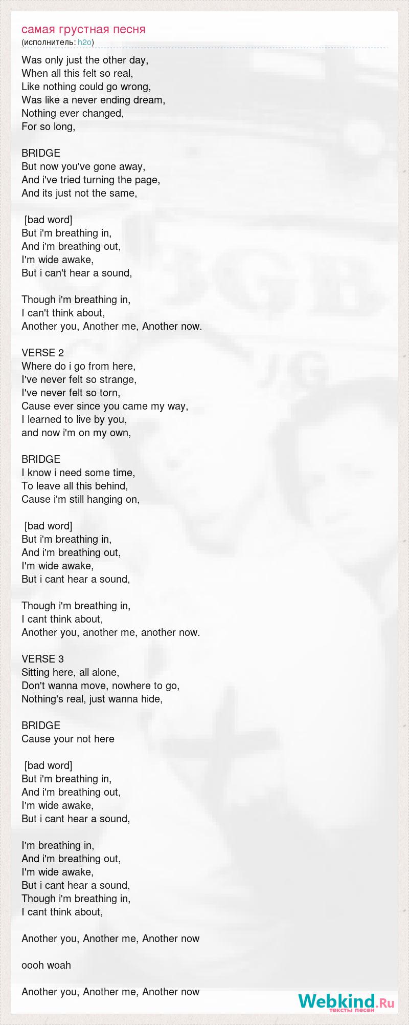 Was only just the other day, When all this felt so real, Like nothing could go wrong, Was like a never ending dream, Nothing ever changed, For so long, BRIDGE But now you've gone away, And i've tried turning the page, And its just not the same, [bad word] But i'm breathing in, And i'm breathing out, I'm wide awake, But i can't hear a sound, Though i'm breathing in, I can't think about, Another you, Another me, Another now. VERSE 2 Where do i go from here, I've never felt so strange, I've never felt so torn, Cause ever since you came my way, I learned to live by you, and now i'm on my own, BRIDGE I know i need some time, To leave all this behind, Cause i'm still hanging on, [bad word] But i'm breathing in, And i'm breathing out, I'm wide awake, But i cant hear a sound, Though i'm breathing in, I cant think about, Another you, another me, another now. VERSE 3 Sitting here, all alone, Don't wanna move, nowhere to go, Nothing's real, just wanna hide, BRIDGE Cause your not here [bad word] But i'm breathing in, And i'm breathing out, I'm wide awake, But i cant hear a sound, I'm breathing in, And i'm breathing out, I'm wide awake, But i cant hear a sound, Though i'm breathing in, I cant think about, Another you, Another me, Another now oooh woah Another you, Another me, Another now
