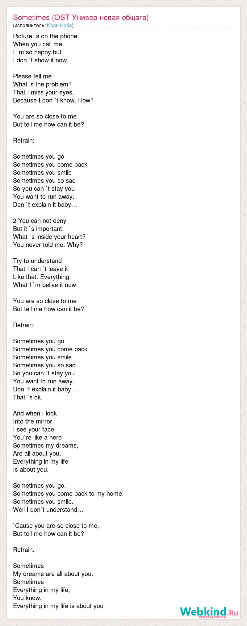 Picture `s on the phone When you call me. I `m so happy but I don `t show it now. Please tell me What is the problem? That I miss your eyes, Because I don `t know. How? You are so close to me But tell me how can it be? Refrain: Sometimes you go Sometimes you come back Sometimes you smile Sometimes you so sad So you can `t stay you You want to run away. Don `t explain it baby… 2 You can not deny But it `s important. What `s inside your heart? You never told me. Why? Try to understand That I can `t leave it Like that. Everything What I `m belive it now. You are so close to me But tell me how can it be? Refrain: Sometimes you go Sometimes you come back Sometimes you smile Sometimes you so sad So you can `t stay you You want to run away. Don `t explain it baby… That `s ok. And when I look Into the mirror I see your face You`re like a hero Sometimes my dreams, Are all about you, Everything in my life Is about you. Sometimes you go. Sometimes you come back to my home. Sometimes you smile. Well I don`t understand… `Cause you are so close to me, But tell me how can it be? Refrain. Sometimes My dreams are all about you. Sometimes Everything in my life, You know, Everything in my life is about you