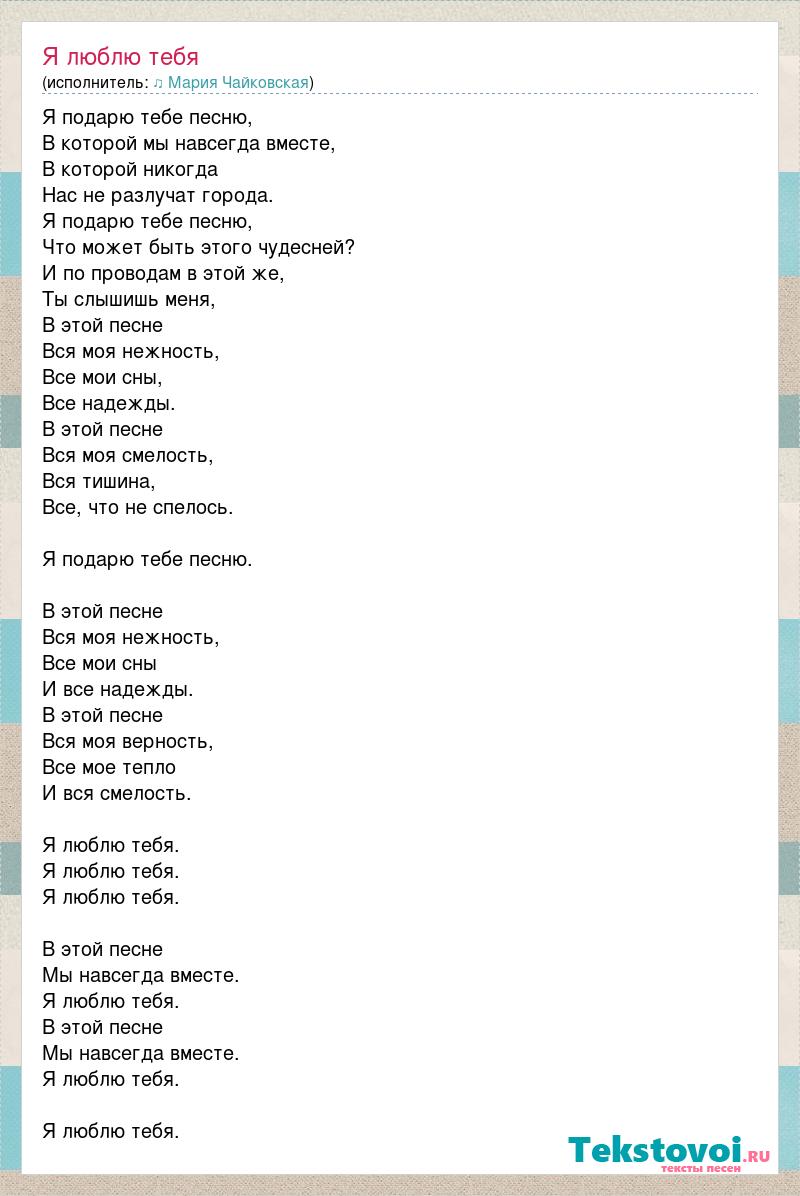 Я подарю тебе песню, В которой мы навсегда вместе, В которой никогда Нас не разлучат города. Я подарю тебе песню, Что может быть этого чудесней? И по проводам в этой же, Ты слышишь меня, В этой песне Вся моя нежность, Все мои сны, Все надежды. В этой песне Вся моя смелость, Вся тишина, Все, что не спелось. Я подарю тебе песню. В этой песне Вся моя нежность, Все мои сны И все надежды. В этой песне Вся моя верность, Все мое тепло И вся смелость. Я люблю тебя. Я люблю тебя. Я люблю тебя. В этой песне Мы навсегда вместе. Я люблю тебя. В этой песне Мы навсегда вместе. Я люблю тебя. Я люблю тебя.