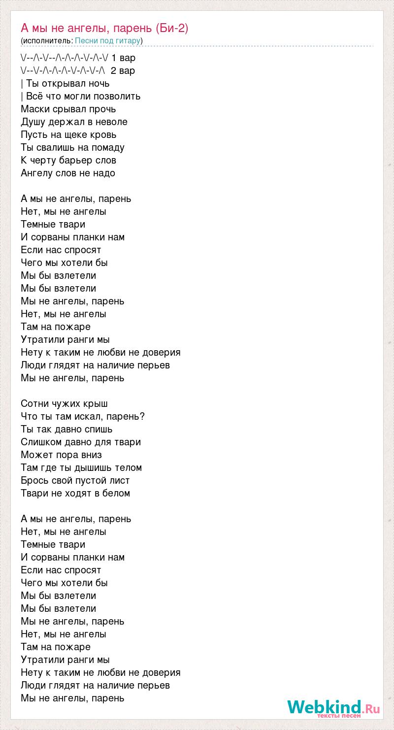 \/--/\-\/--/\-/\-/\-\/-/\-\/ 1 вар \/--\/-/\-/\-/\-\/-/\-\/-/\ 2 вар | Ты открывал ночь | Всё что могли позволить Маски срывал прочь Душу держал в неволе Пусть на щеке кровь Ты свалишь на помаду К черту барьер слов Ангелу слов не надо А мы не ангелы, парень Нет, мы не ангелы Темные твари И сорваны планки нам Если нас спросят Чего мы хотели бы Мы бы взлетели Мы бы взлетели Мы не ангелы, парень Нет, мы не ангелы Там на пожаре Утратили ранги мы Нету к таким не любви не доверия Люди глядят на наличие перьев Мы не ангелы, парень Сотни чужих крыш Что ты там искал, парень? Ты так давно спишь Слишком давно для твари Может пора вниз Там где ты дышишь телом Брось свой пустой лист Твари не ходят в белом А мы не ангелы, парень Нет, мы не ангелы Темные твари И сорваны планки нам Если нас спросят Чего мы хотели бы Мы бы взлетели Мы бы взлетели Мы не ангелы, парень Нет, мы не ангелы Там на пожаре Утратили ранги мы Нету к таким не любви не доверия Люди глядят на наличие перьев Мы не ангелы, парень