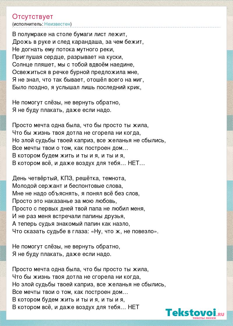 В полумраке на столе бумаги лист лежит, Дрожь в руке и след карандаша, за чем бежит, Не догнать ему потока мутного реки, Приглушая сердце, разрывает на куски, Солнце пляшет, мы с тобой вдвоём наедине, Освежиться в речке бурной предложила мне, Я не знал, что так бывает, отошёл всего на миг, Было поздно, я услышал лишь последний крик, Не помогут слёзы, не вернуть обратно, Я не буду плакать, даже если надо. Просто мечта одна была, что бы просто ты жила, Что бы жизнь твоя дотла не сгорела ни когда, Но злой судьбы твоей каприз, все желанья не сбылись, Все мечты твои о том, как построен дом… В котором будем жить и ты и я, и ты и я, В котором всё, и даже воздух для тебя… НЕТ… День четвёртый, КПЗ, решётка, темнота, Молодой сержант и беспонтовые слова, Мне не надо объяснять, я понял всё без слов, Просто это наказанье за мою любовь, Просто с первых дней твой папа не любил меня, И не раз меня встречали папины друзья, А теперь судья знакомый папин как назло, Что сказать судьбе в глаза: «Ну, что ж, не повезло». Не помогут слёзы, не вернуть обратно, Я не буду плакать, даже если надо. Просто мечта одна была, что бы просто ты жила, Что бы жизнь твоя дотла не сгорела ни когда, Но злой судьбы твоей каприз, все желанья не сбылись, Все мечты твои о том, как построен дом… В котором будем жить и ты и я, и ты и я, В котором всё, и даже воздух для тебя… НЕТ