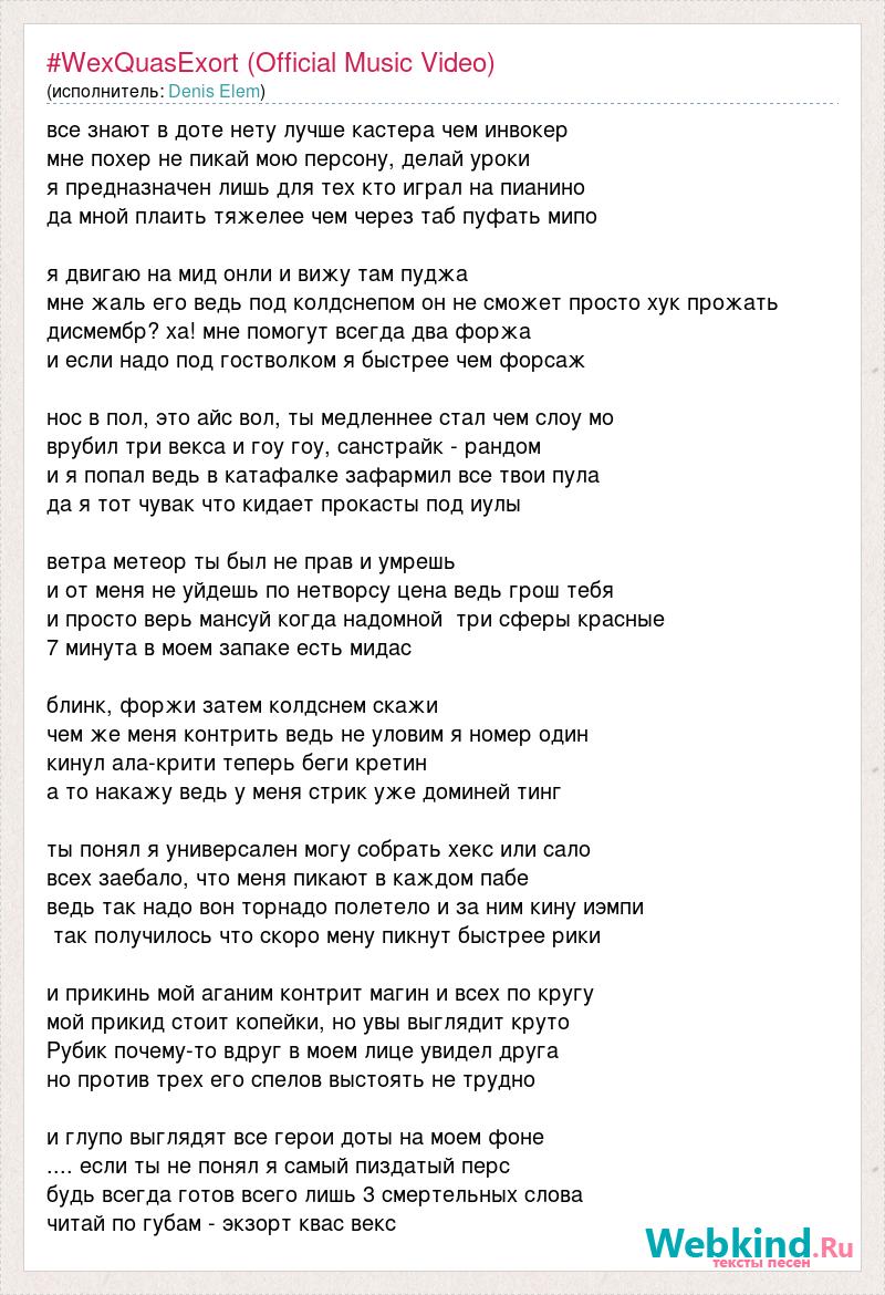 все знают в доте нету лучше кастера чем инвокер мне похер не пикай мою персону, делай уроки я предназначен лишь для тех кто играл на пианино да мной плаить тяжелее чем через таб пуфать мипо я двигаю на мид онли и вижу там пуджа мне жаль его ведь под колдснепом он не сможет просто хук прожать дисмембр? ха! мне помогут всегда два форжа и если надо под гостволком я быстрее чем форсаж нос в пол, это айс вол, ты медленнее стал чем слоу мо врубил три векса и гоу гоу, санстрайк - рандом и я попал ведь в катафалке зафармил все твои пула да я тот чувак что кидает прокасты под иулы ветра метеор ты был не прав и умрешь и от меня не уйдешь по нетворсу цена ведь грош тебя и просто верь мансуй когда надомной три сферы красные 7 минута в моем запаке есть мидас блинк, форжи затем колдснем скажи чем же меня контрить ведь не уловим я номер один кинул ала-крити теперь беги кретин а то накажу ведь у меня стрик уже доминей тинг ты понял я универсален могу собрать хекс или сало всех заебало, что меня пикают в каждом пабе ведь так надо вон торнадо полетело и за ним кину иэмпи так получилось что скоро мену пикнут быстрее рики и прикинь мой аганим контрит магин и всех по кругу мой прикид стоит копейки, но увы выглядит круто Рубик почему-то вдруг в моем лице увидел друга но против трех его спелов выстоять не трудно и глупо выглядят все герои доты на моем фоне .... если ты не понял я самый пиздатый перс будь всегда готов всего лишь 3 смертельных слова читай по губам - экзорт квас векс