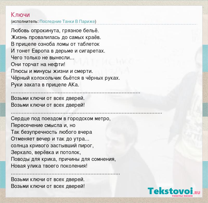 Любовь опрокинута, грязное бельё. Жизнь провалилась до самых краёв. В прицеле озноба ломы от таблеток И тонет Европа в дерьме и сигаретах. Чего только не вынесли... Они торчат на нефти! Плюсы и минусы жизни и смерти. Чёрный колокольчик бьётся в чёрных руках. Руки заката в прицеле АКа. ................................................................................... Возьми ключи от всех дверей. Возьми ключи от всех дверей! ................................................................................................. Сердце под поездом в городском метро, Пересечение смысла и, но Так безупречность любого вчера Отменяет вечер и так до утра... солнца кривого застывший пирог, Зеркало, верёвка и потолок, Поводы для крика, причины для сомнения, Новая улика твоего поколения! ...................................................................... Возьми ключи от всех дверей. Возьми ключи от всех дверей!